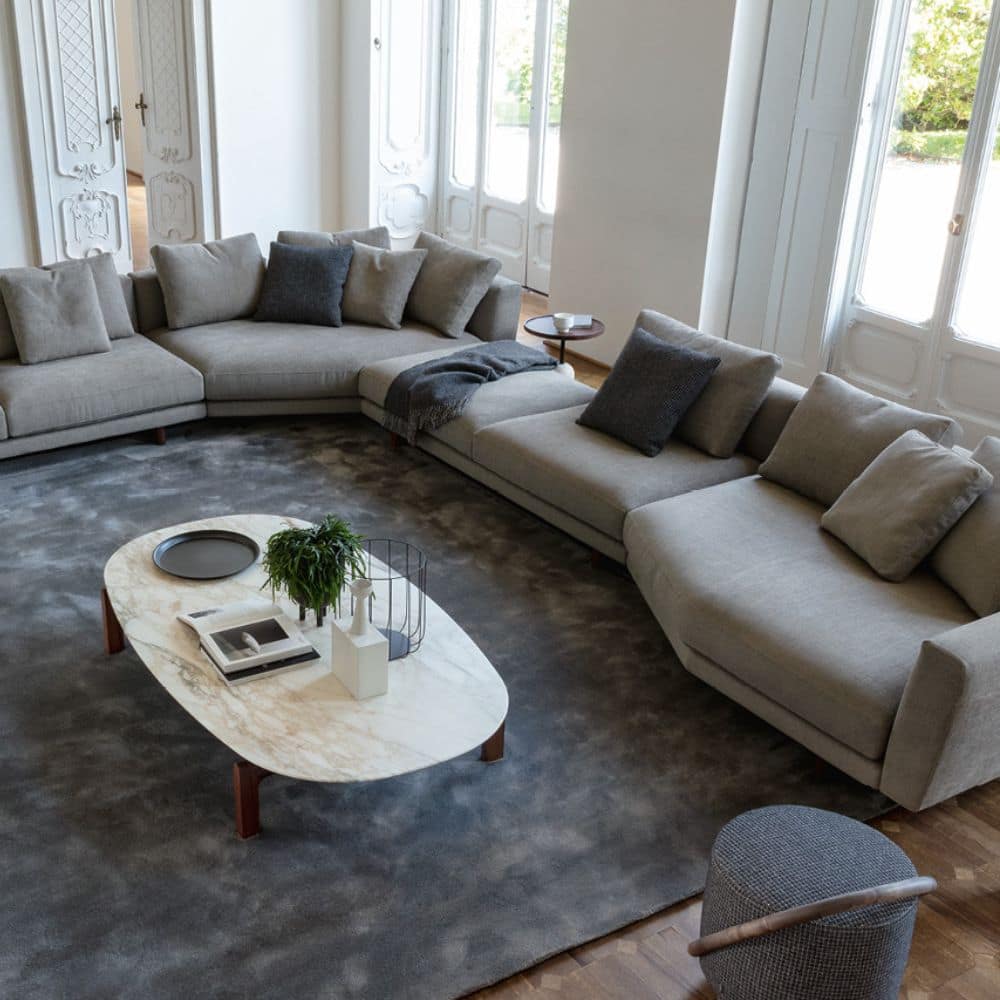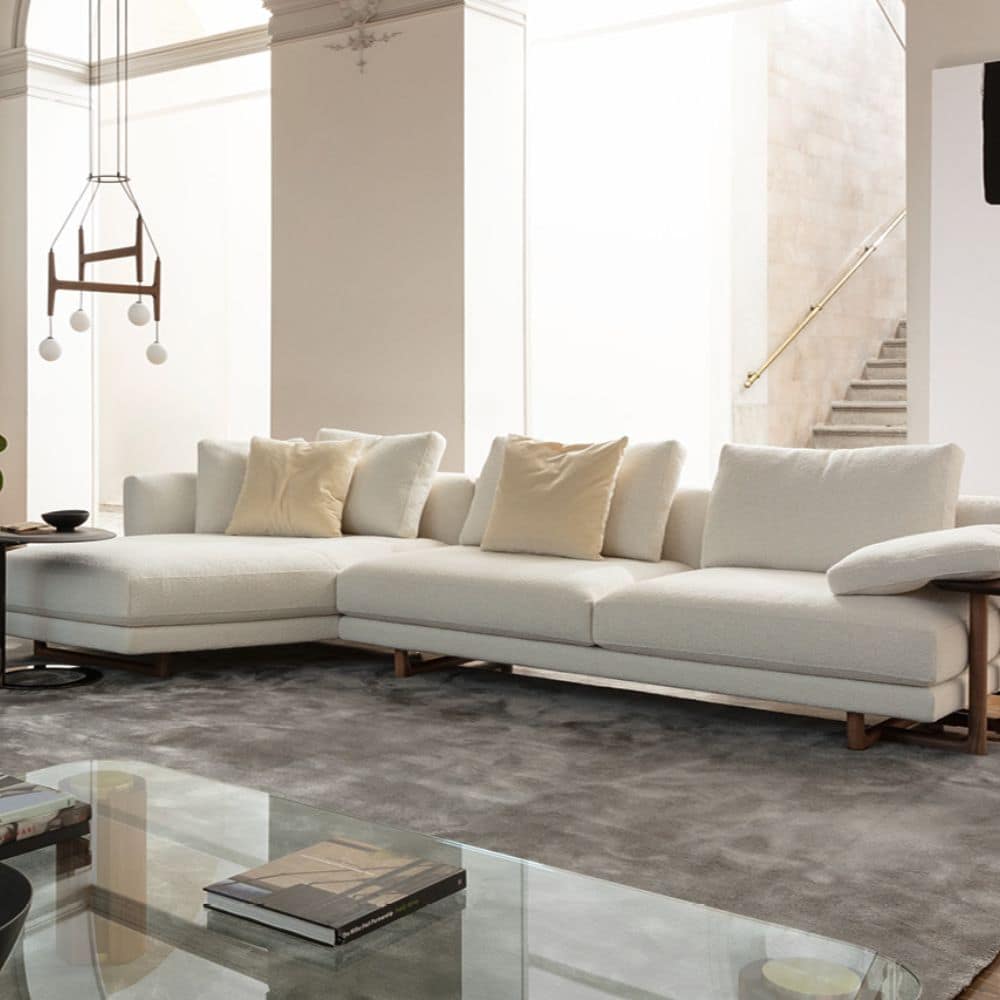 A combination of various geometric shapes stands out the modular seating system Abacus, with frame in solid Canaletta walnut and black chromed or brushed brass end-feet. The main feature of this modular sofa is the versatility, thanks to a wide ease of positioning of the modules.