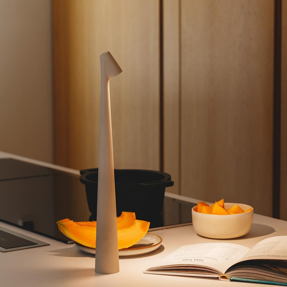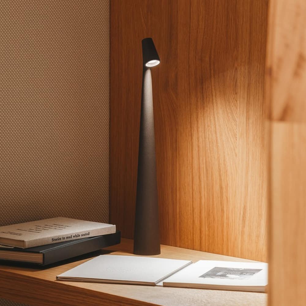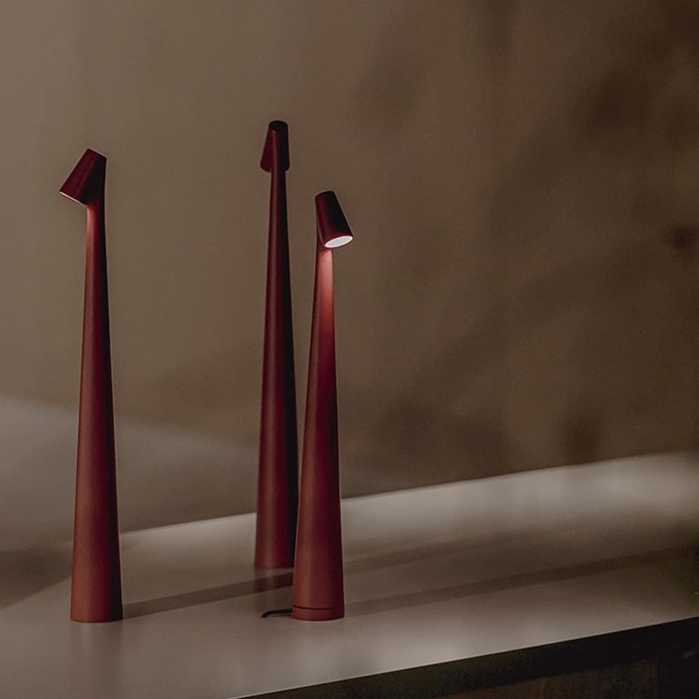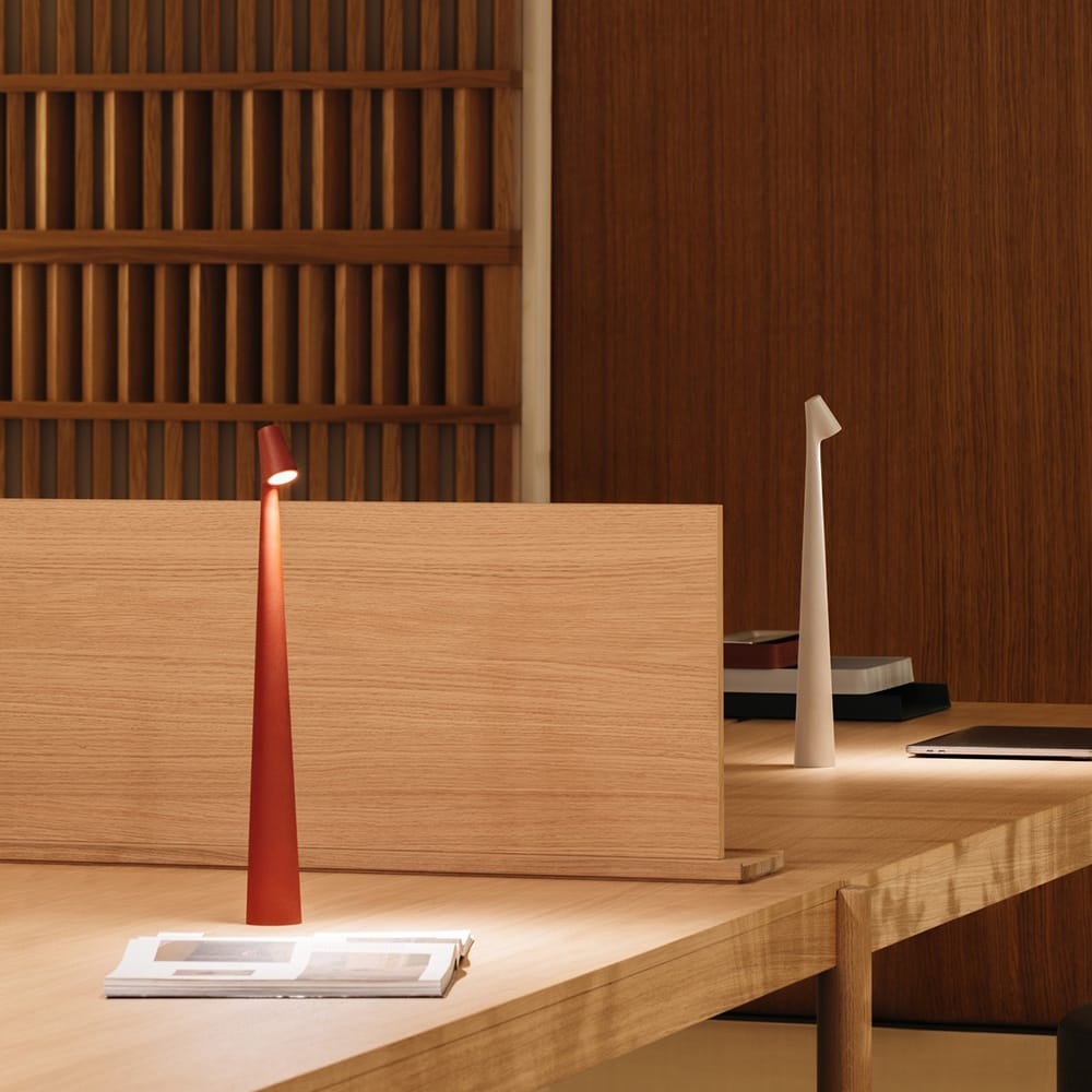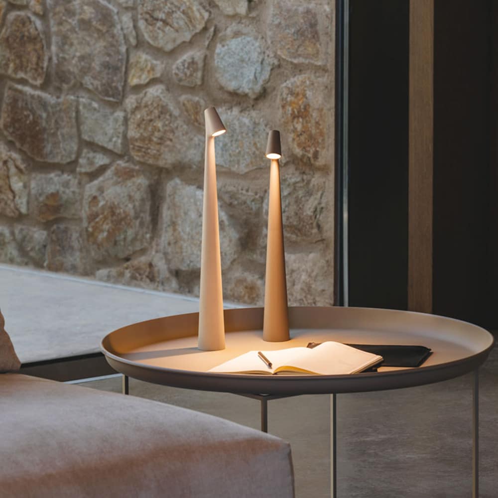 The Africa table lamp combines richness of form and materiality with high-performance lighting capabilities. Defined by a slender, conical stem that leads to a neat head, this luminaire invites you to reach out and grasp it. Available in two sizes, Africa portable lamp’s lacquered matte texture and four natural tones bring warmth and tangibility to the design. Its chargeable LED light source provides three levels of intensity which are controlled by a simple push button at the head.