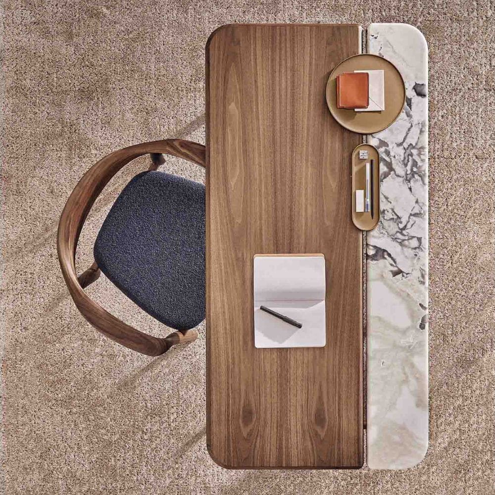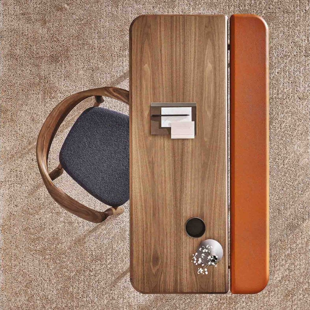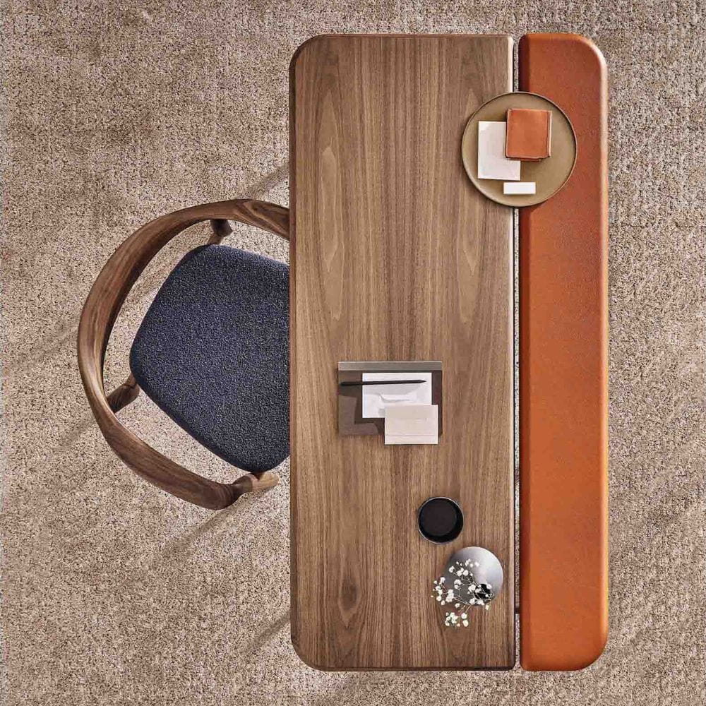 Functionality and aesthetics came together to create Aksel, a contemporary and essential desk that is also rich in details to enhance its uniqueness. The distinctive feature of Aksel is the structure of the top divided in two sections separated by a cut that allows to combine different materials: the main section of the top is always in canaletta walnut, while the back section is available in marble or Plus leather with colours from the collection.