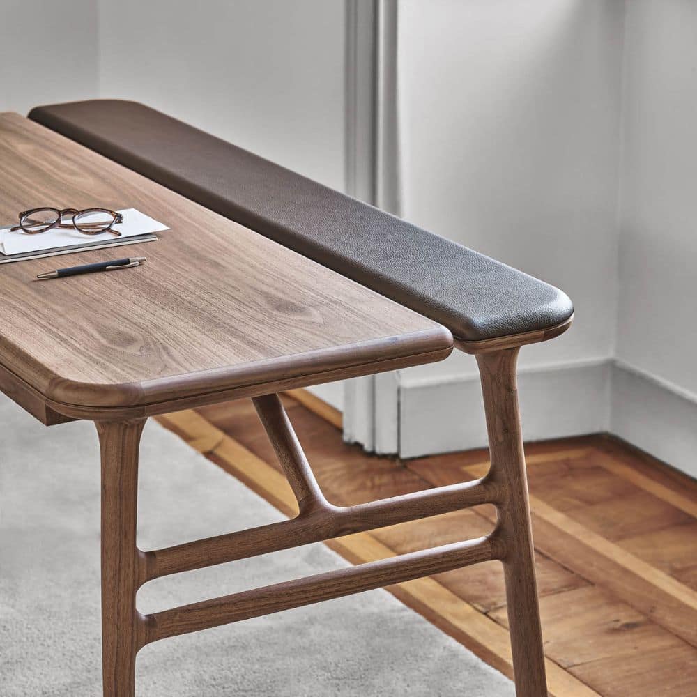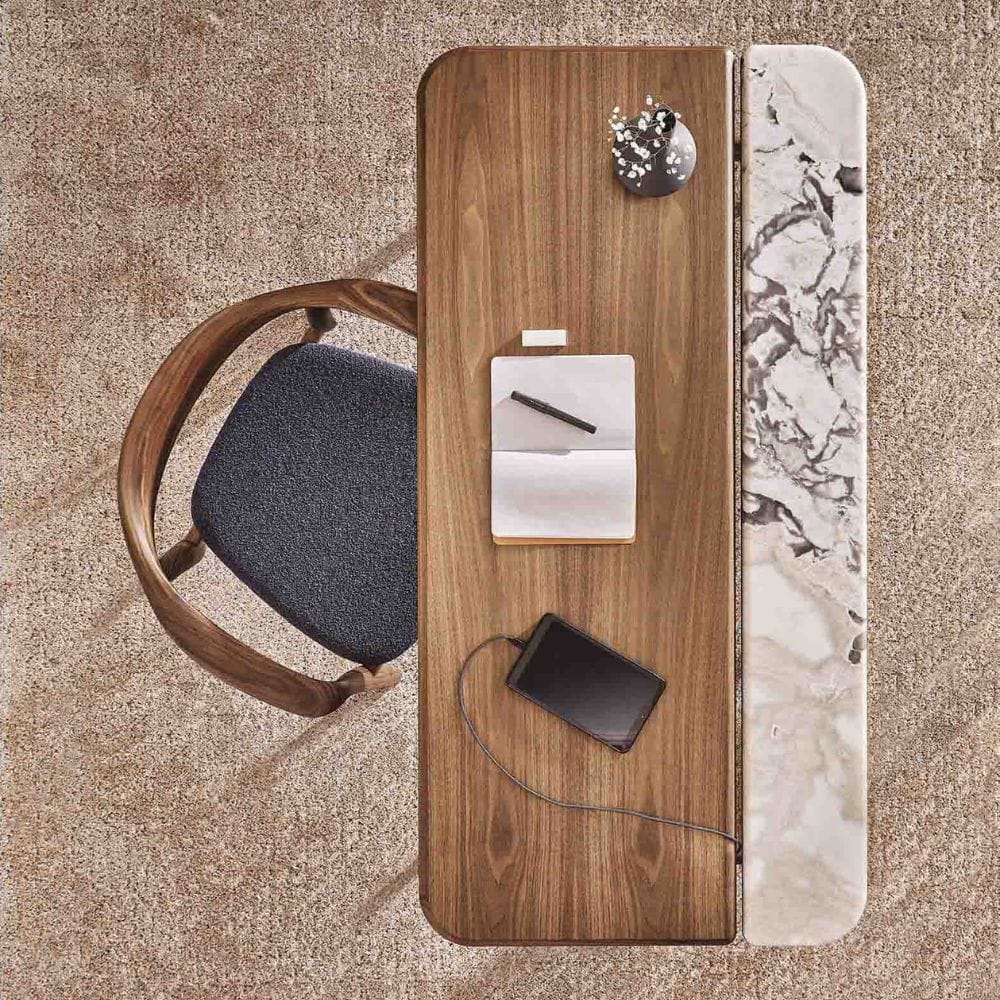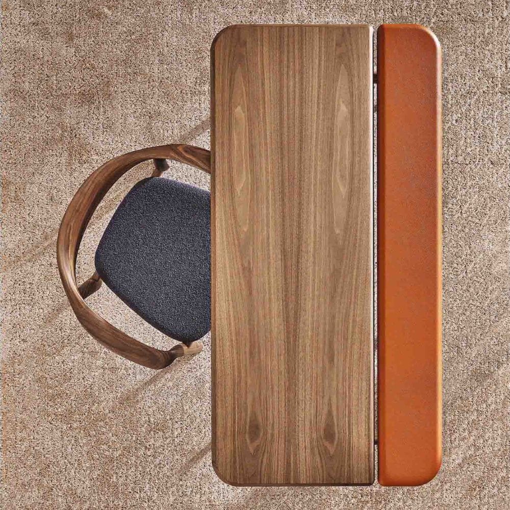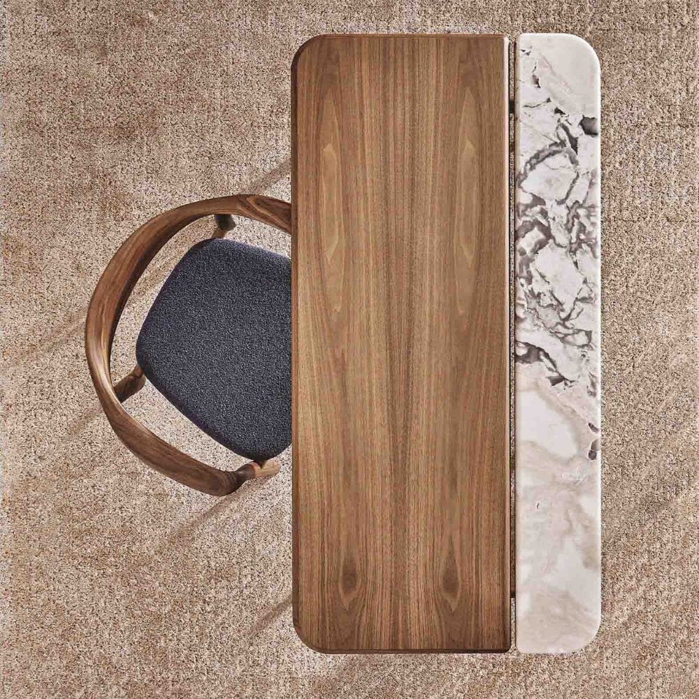 Functionality and aesthetics came together to create Aksel, a contemporary and essential desk that is also rich in details to enhance its uniqueness. The distinctive feature of Aksel is the structure of the top divided in two sections separated by a cut that allows to combine different materials: the main section of the top is always in canaletta walnut, while the back section is available in marble or Plus leather with colours from the collection.