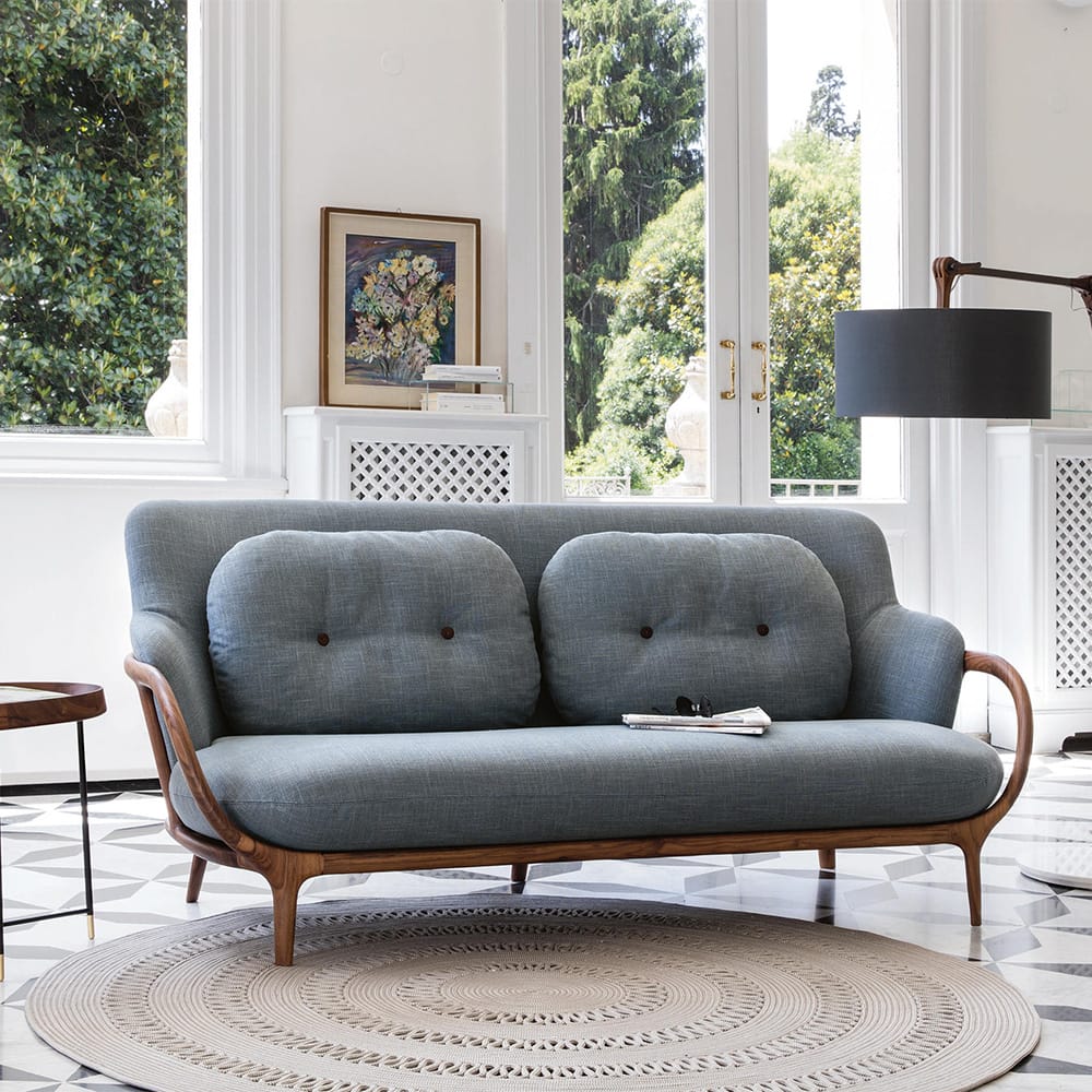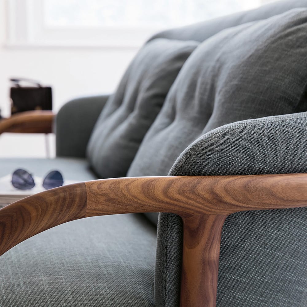 The Allison sofa by Porada brings rustic style to your modern living area. The unique design features an intricately carved wooden frame with a geometric, striped pattern along the back with curved arms. In addition to being aesthetically pleasing, the wooden frame also is very durable and supportive. This sofa offers comfort for hours, thanks to the soft cushioned lining and luxurious upholstery. Also, the button-tufted back cushions feature feather filling that molds comfortably to your body as you unwind and relax.