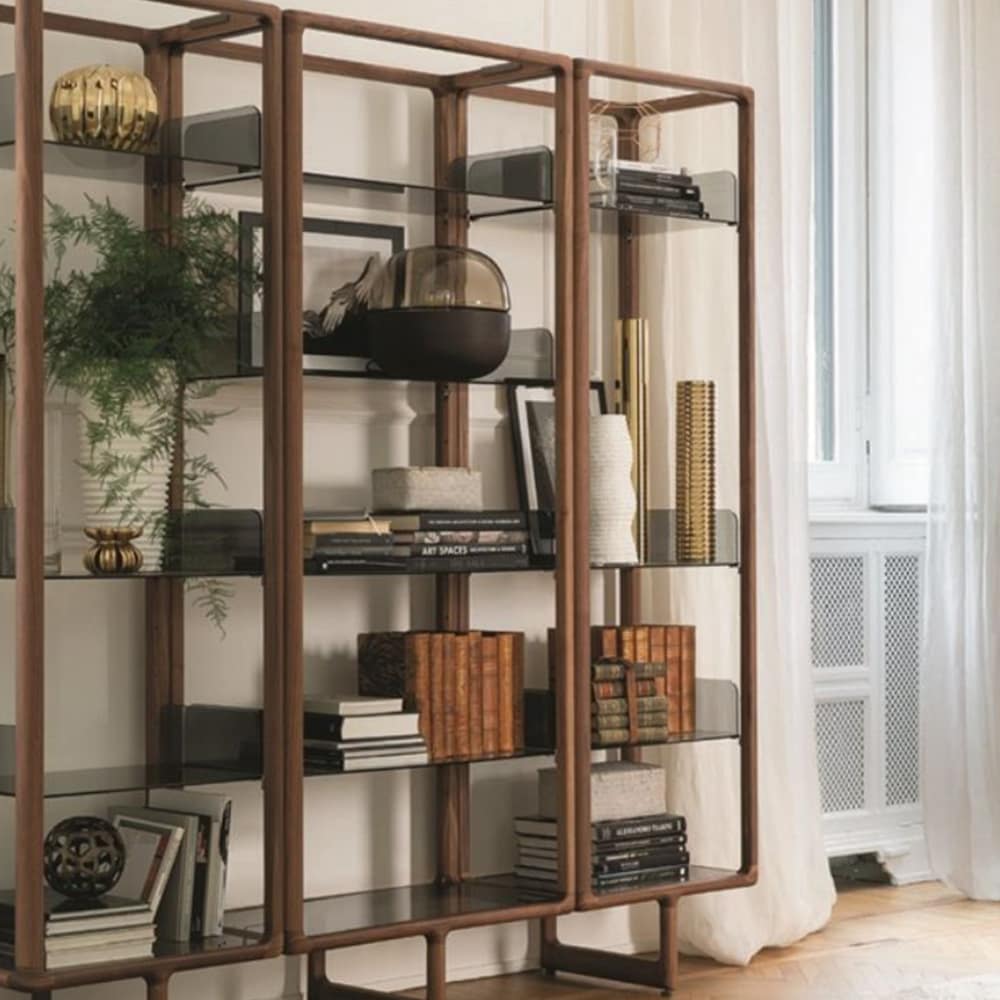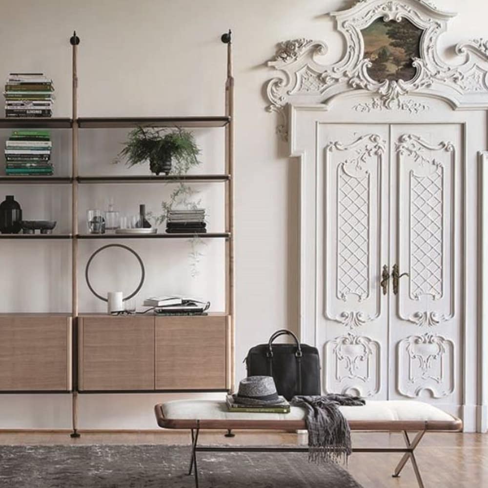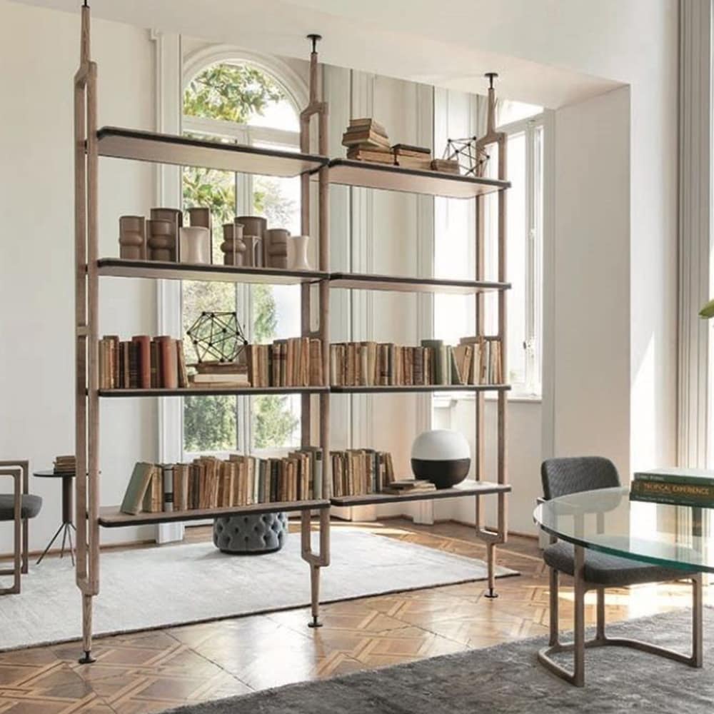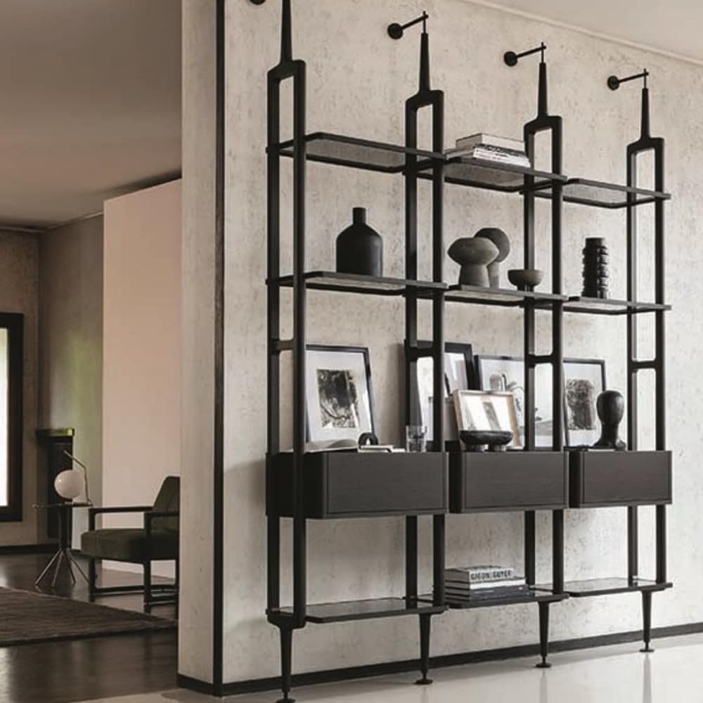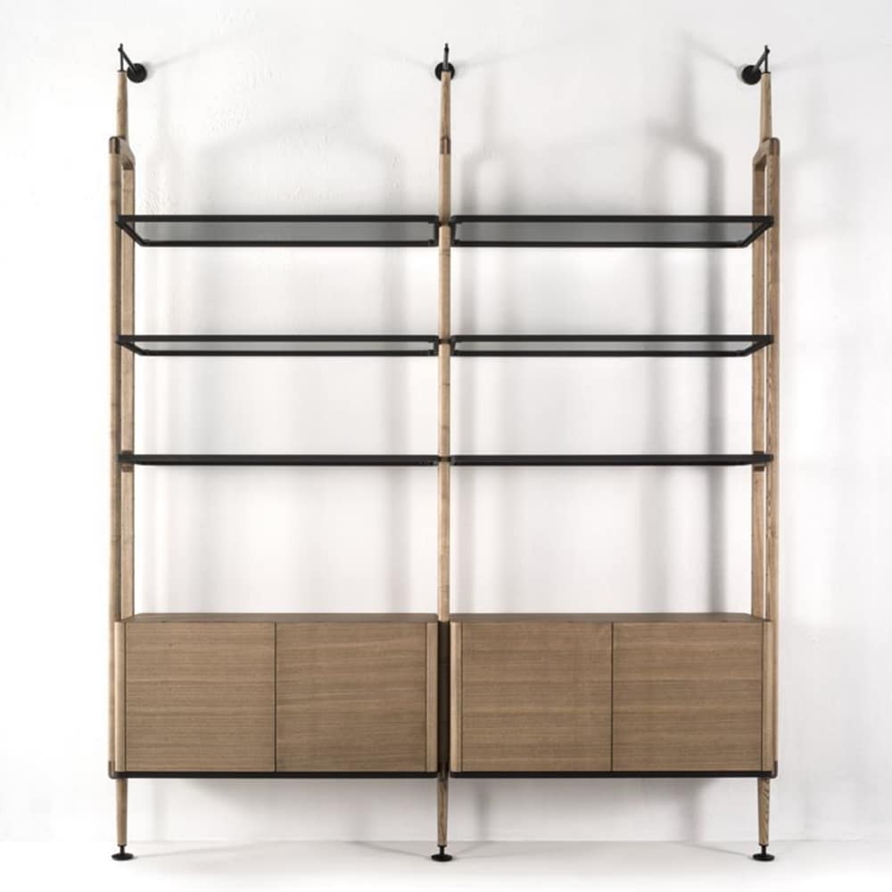 The Aria bookcase is an incredibly versatile modular shelving and storage system made in ash wood which can be left natural or stained in a range of finishes. Designed by David Dolcini exclusively for Italian brand @Poradafurniture.The ash wood columns can be fixed to the wall, or attached to the ceiling to create an intriguing room divider. Customise your piece further by adding shelves in ash or smoked glass, chests of drawers or containers in ash. The connecting frames and shelf details are in matt black metal.