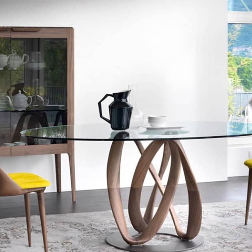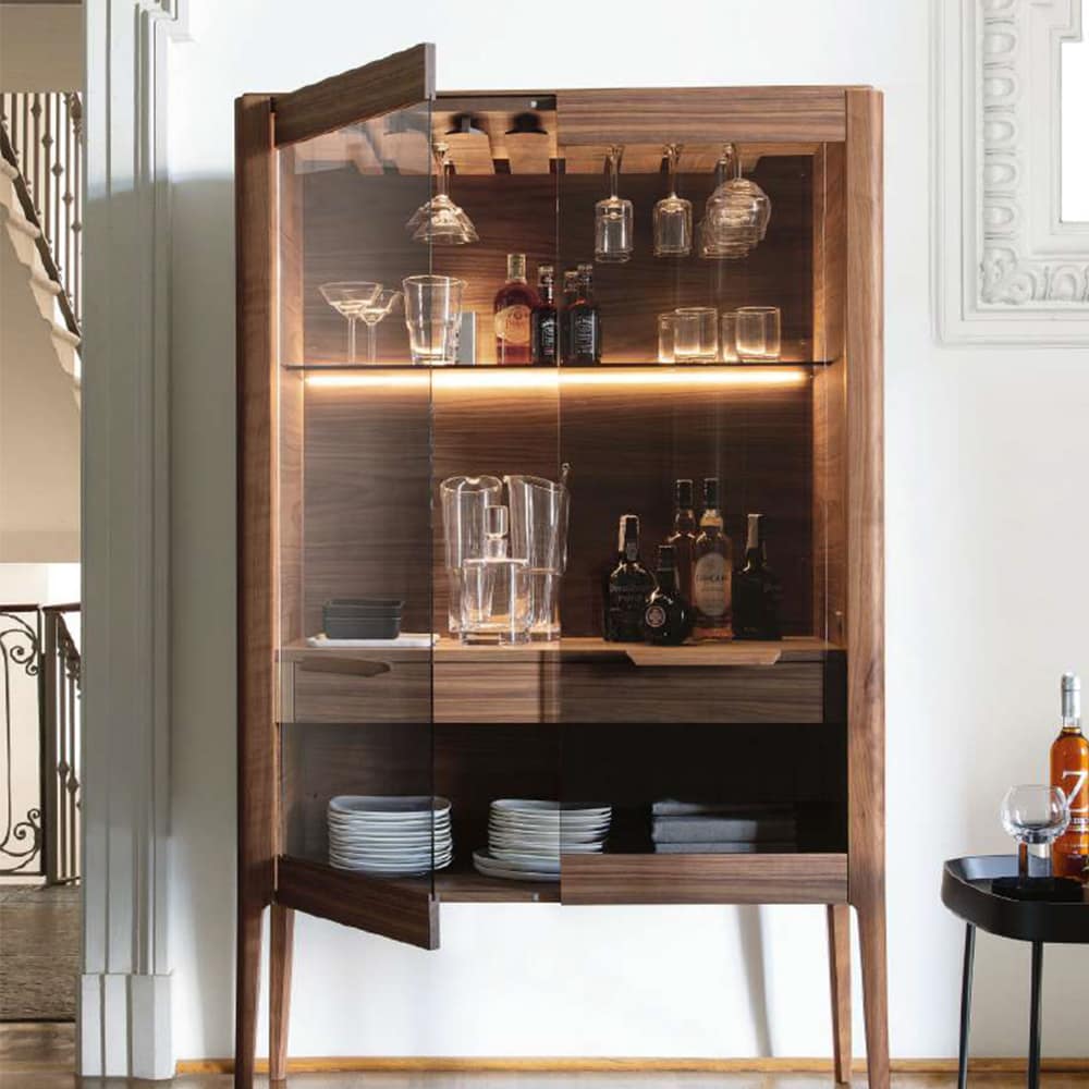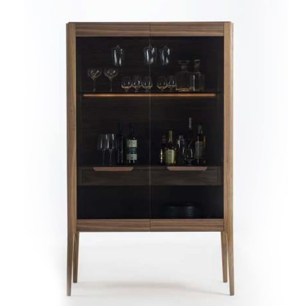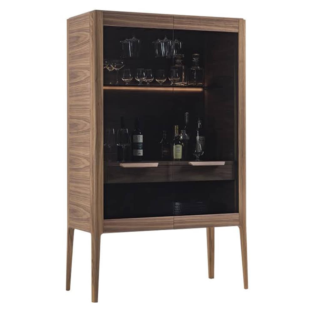 Bar cabinet in canaletta walnut or ash with two doors in smoked glass and wooden top. Equipped with three compartments with glass holder and drawer with soft closure. Inside shelf in smoked glass. The central compartment is LED lighted through a remote control system. It is possible to insert the MIX TRAY in the drawer.