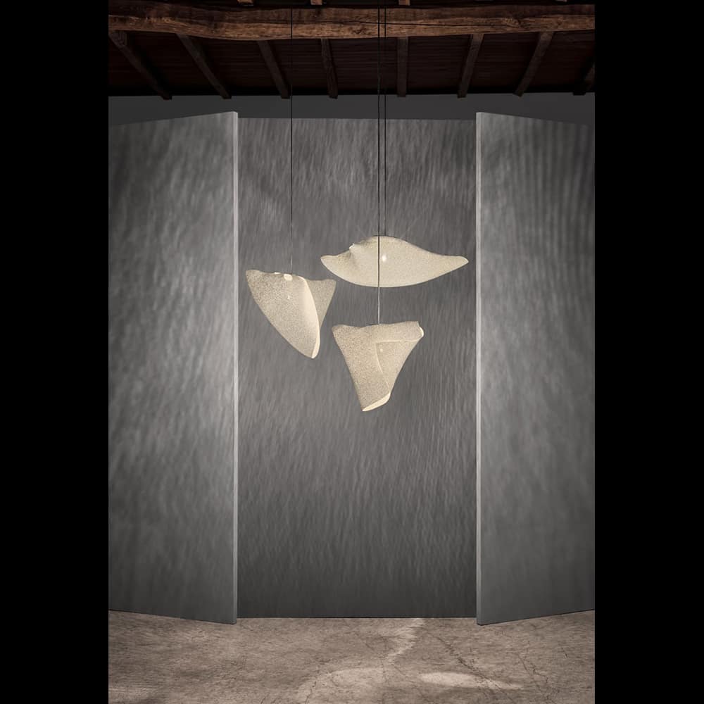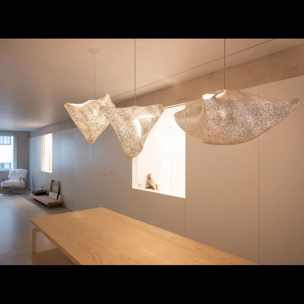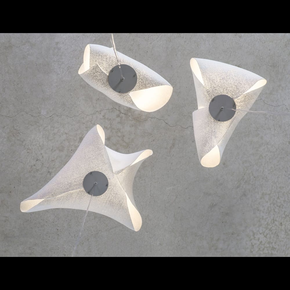 The Ballet collection arises from experimentation, giving rise to forms created from the overlapping or joining of its vertices, leaving freedom to the flexible nature of the material itself. The three pendant lamps of the Ballet collection come together in a spectacular hanging composition to represent the three movements of dance. Fluid, natural and asymmetrical volumes that make their shapes change depending on the point of view. Plié, Relevé, Elancé… A constant dance of light and shadows designed by Héctor Serrano.