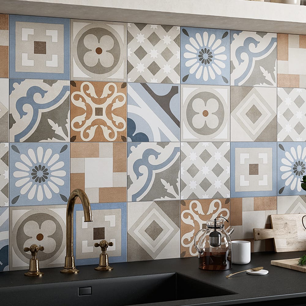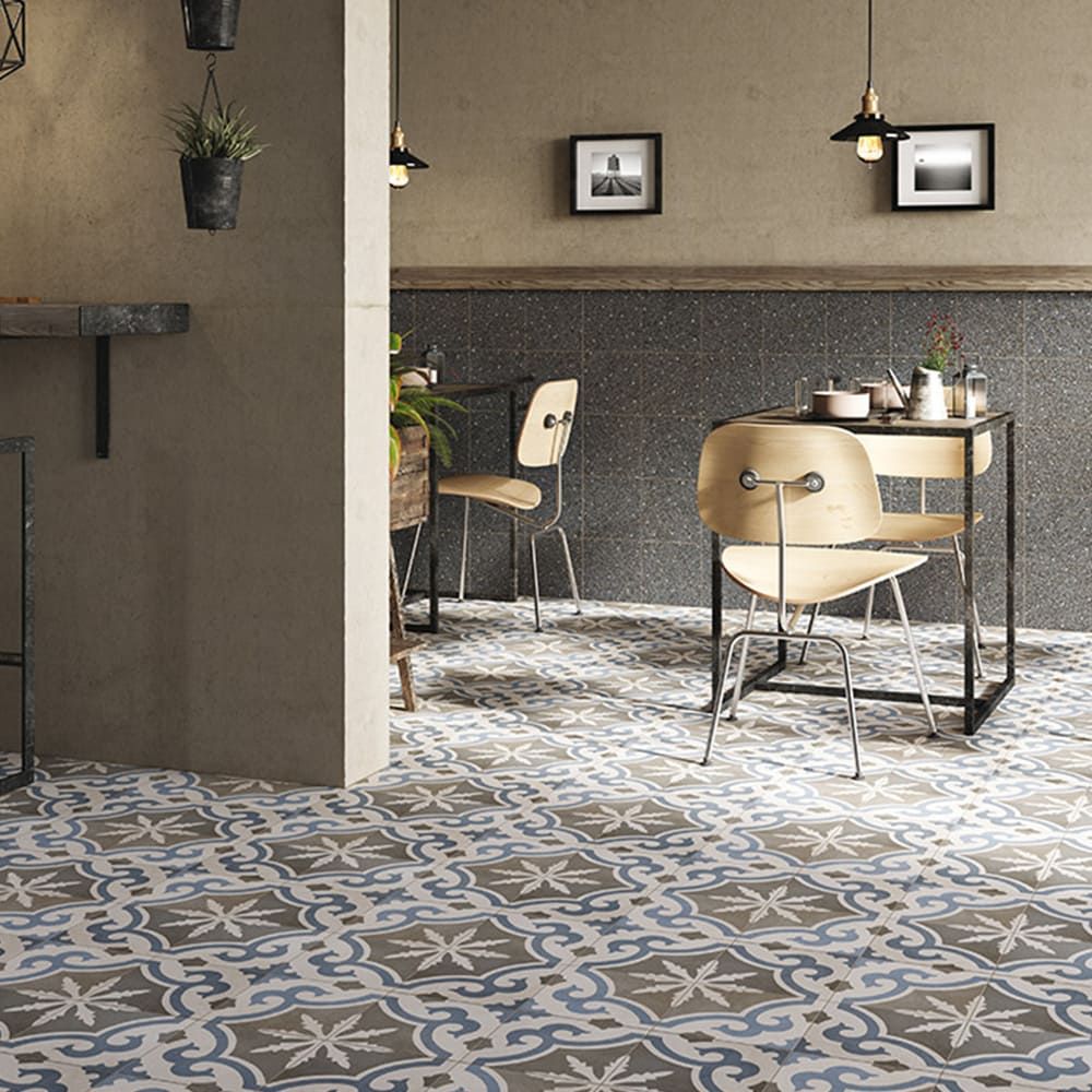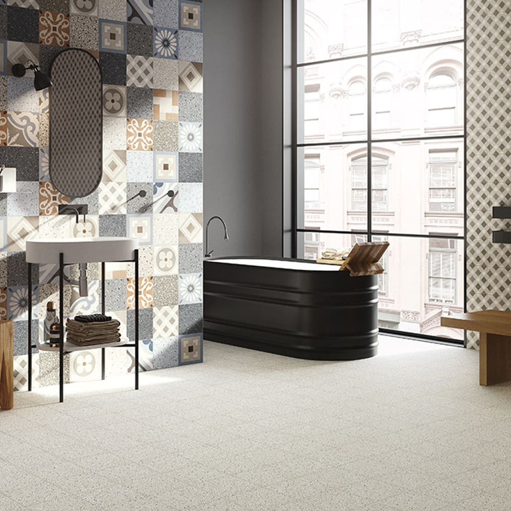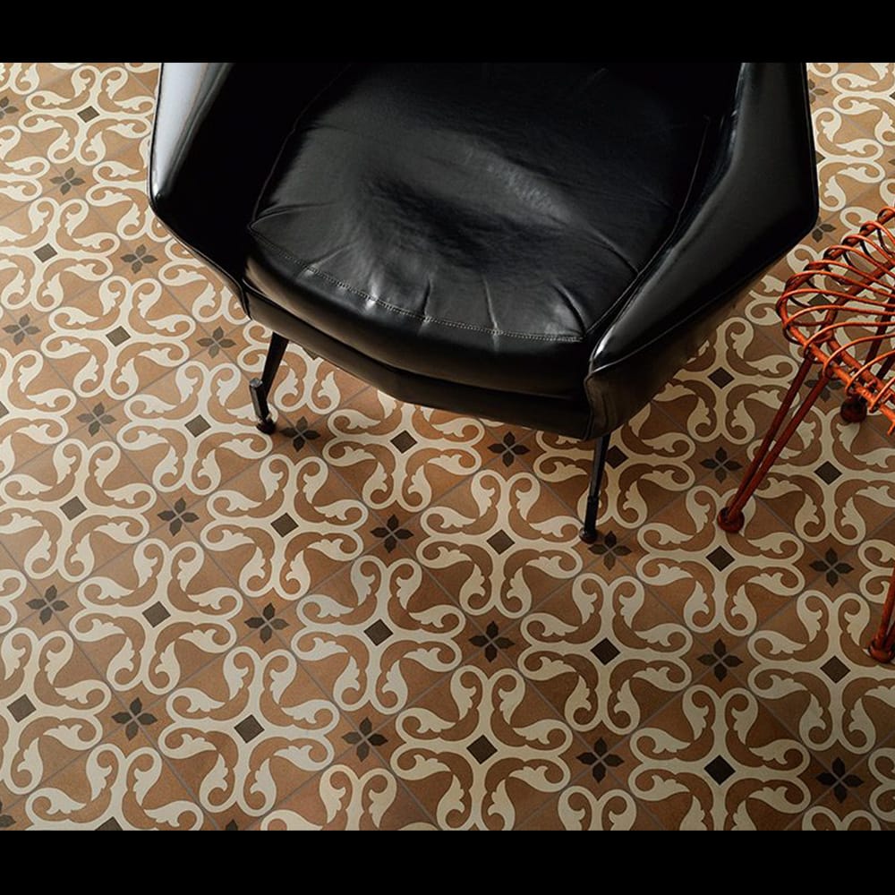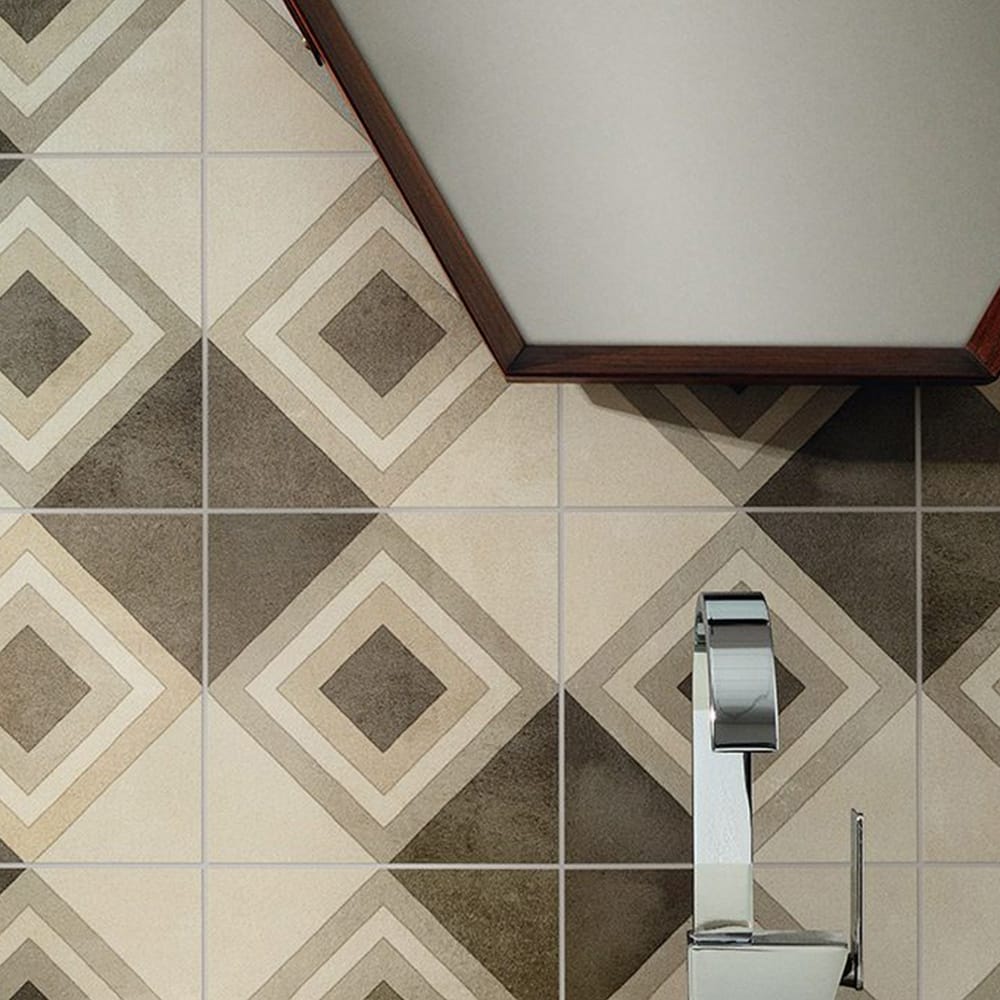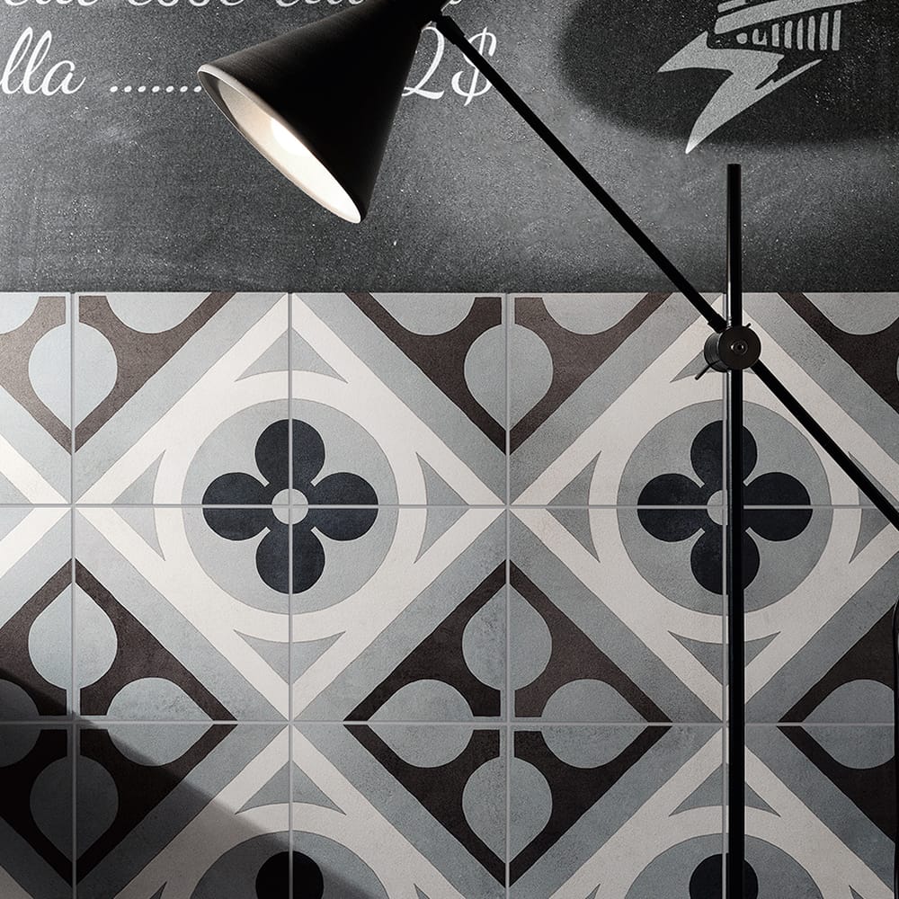 Inspired by traditional hexagonal or square concrete floor tiles whose dominant colours often came in shades of grey and brick. In the early 20th century, cementine and concrete chip floors were extremely successful: as they were considered strong and cheap, they were often used for the flooring in both service areas and work spaces. The composition was based on a simple alternation of colours, but cementine tiles were also used to create much more sophisticated decorations, with flowers, meanders and other patterns interpreting the fashionable Liberty and Deco styles, and were also a fresh alternative to carpets, while guaranteeing the same functional demarcation of spaces and visual strength. This revival has become a trend, reinterpreted once more on a ceramic tile with new stylistic and colour solutions.