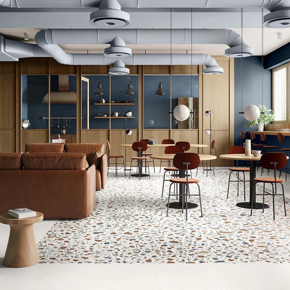 THE BEAUTY OF DETAIL, THE LIVELY PLAY OF THE TERRAZZO PATTERN CONCRETE, WITH CERAMIC ARABESQUE INSERTS.