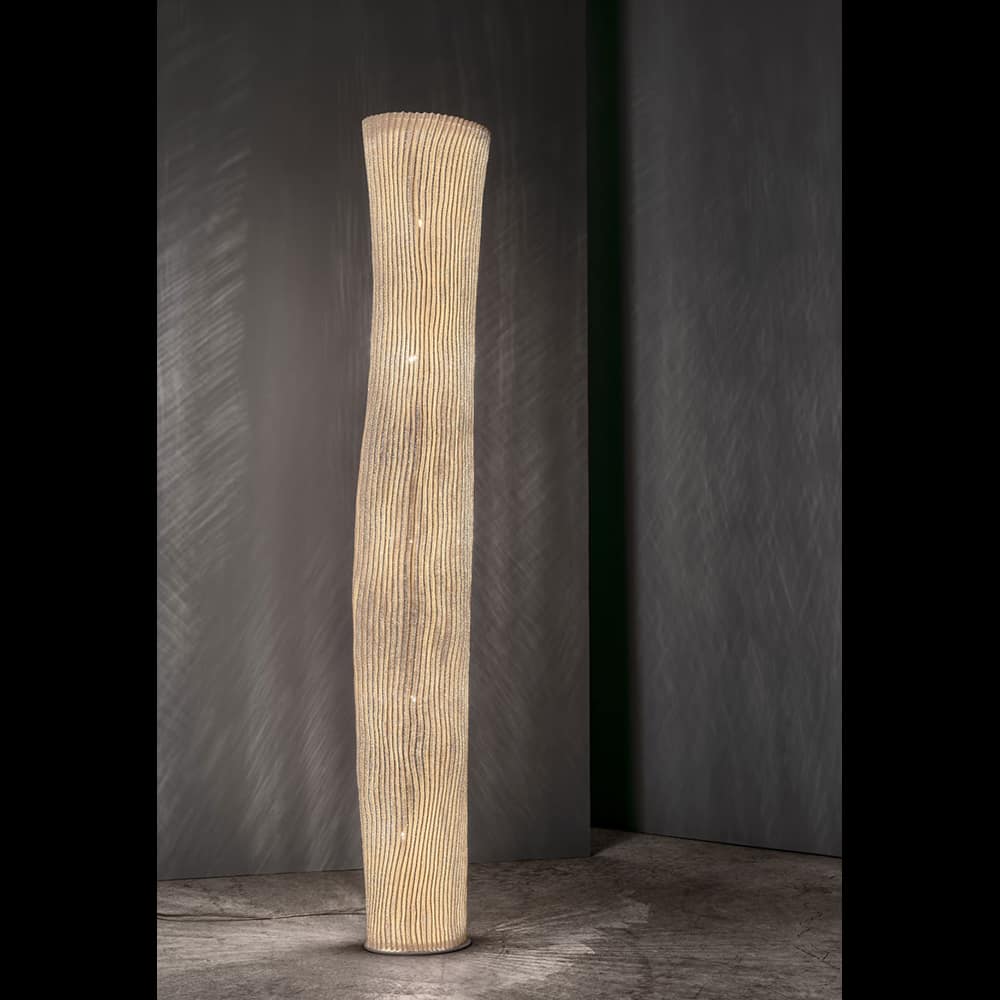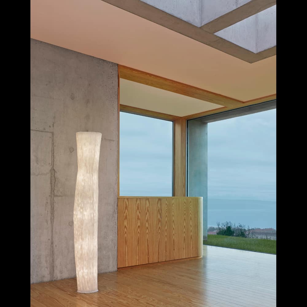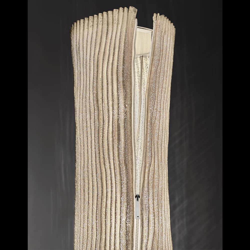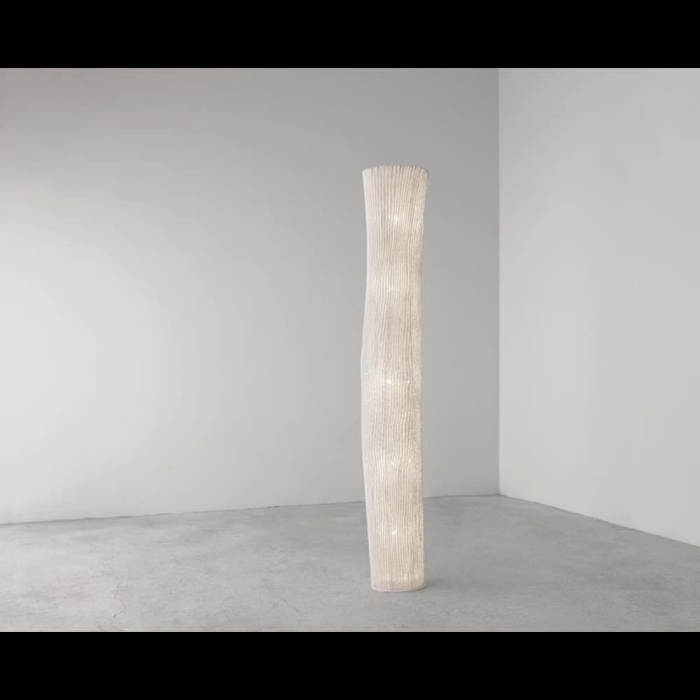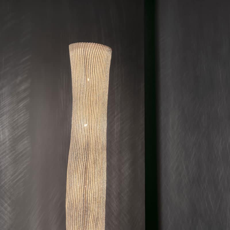 The Gea collection takes its name from the primordial goddess, mother earth. The stylized luminaires that comprise it resemble upright female figures that defy verticality, enveloped in a ribbed veil of painted stainless steel mesh that clings to their subtle curves. The Gea floor lamp, designed by Arturo Álvarez, features a zipper that allows the handmade mesh piece to be opened or closed. It emits a soft, enveloping light, which is evenly distributed throughout the structure. The main piece of the collection, which won a Good Design Award in 2007, is the floor lamp, an elegant sculptural volume that blends into any environment, adding a note of distinction to the room.
