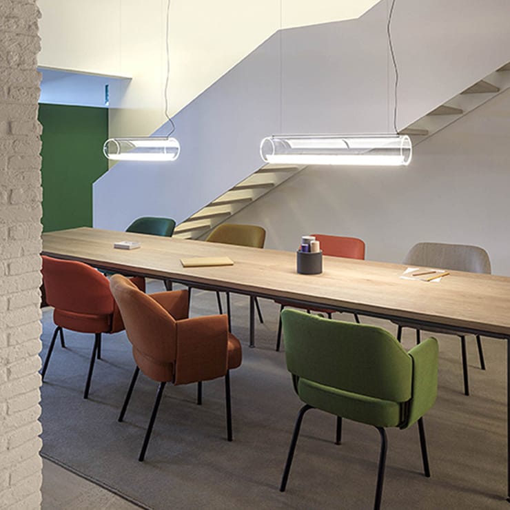The Guise collection includes pendant lamps, both vertical and horizontal, that allows them to be placed over dining tables, offices or sitting rooms and circulation areas, with single fittings or multiple configurations.
