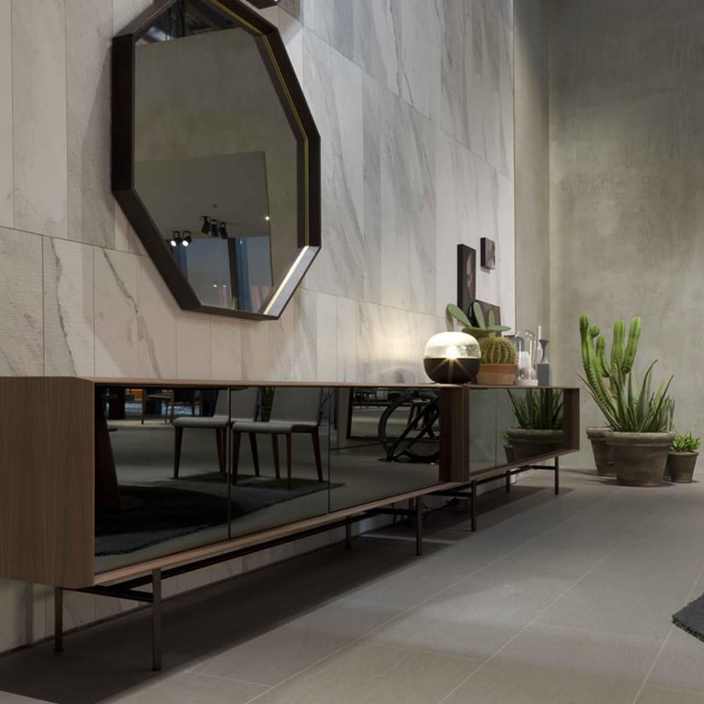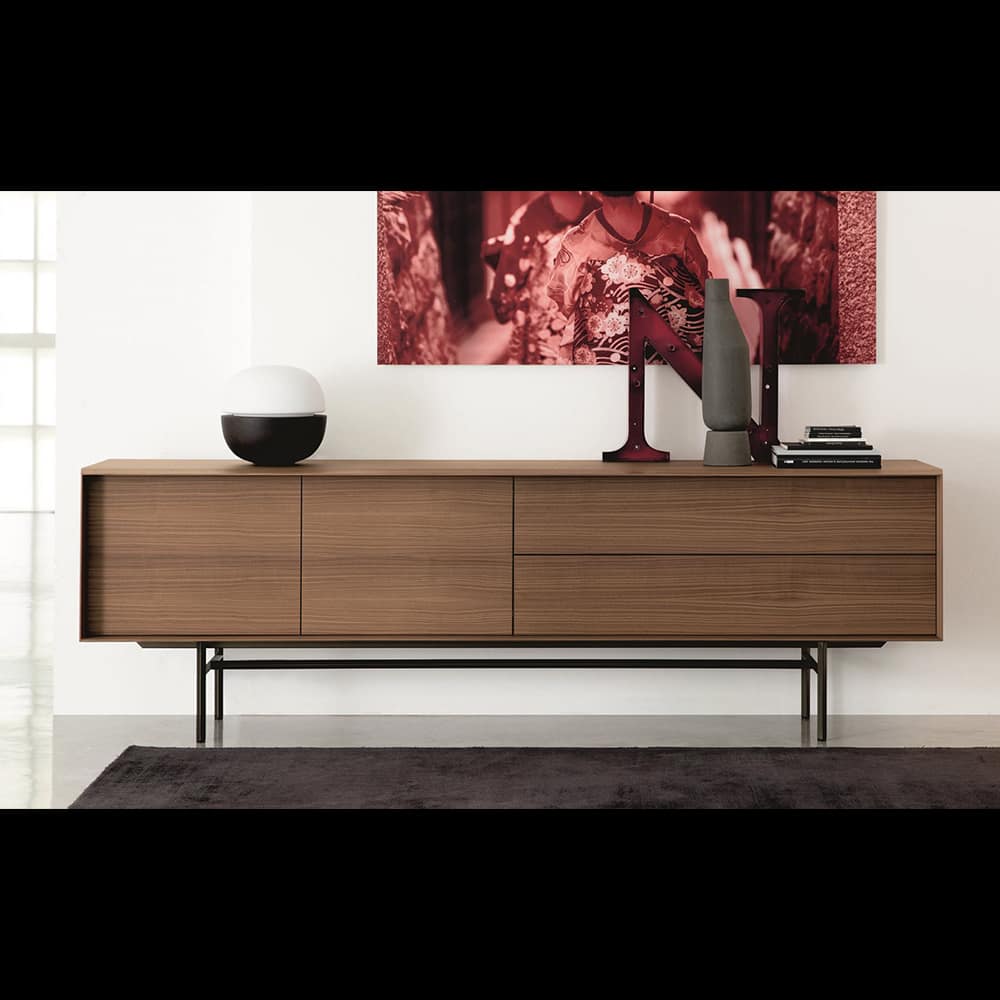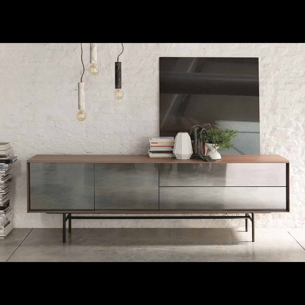 Sideboard in canaletta walnut with two doors with touch opening and two total extraction drawers with push pull system. Fronts available in wood or covered in smoked mirror. Bronzoro metal base and internal part of the drawers canaletta walnut veneered.