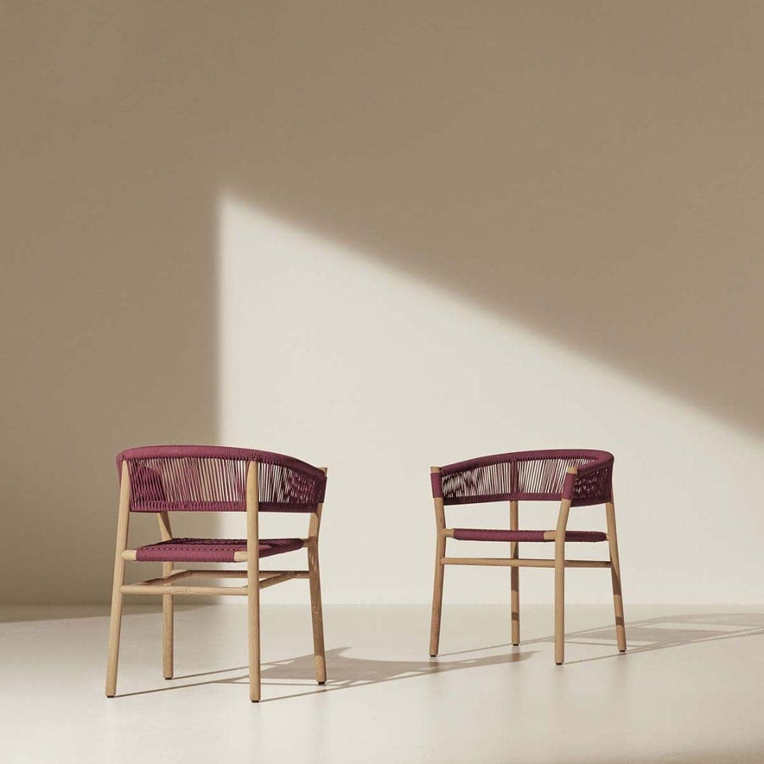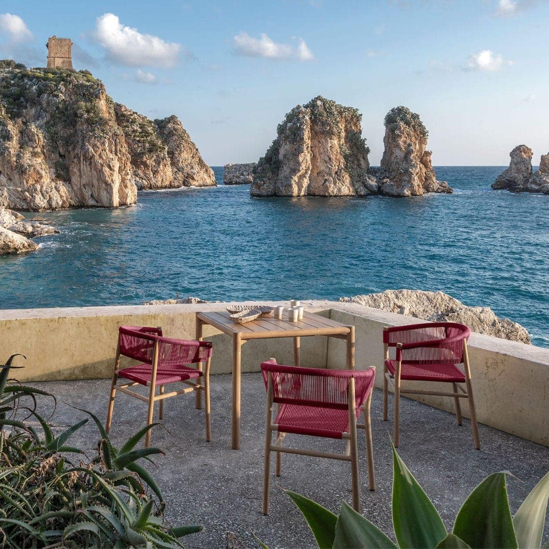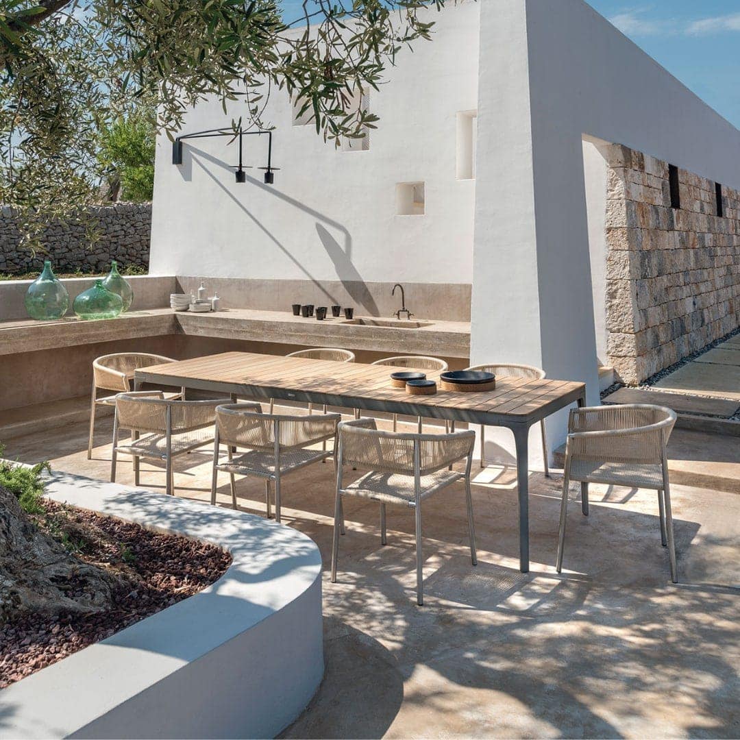 Available in versions with a teak or stainless steel structure, is able to express different looks and interpret the space that welcomes it. The braided rope stretches its thick texture to embrace the texture of the teak.