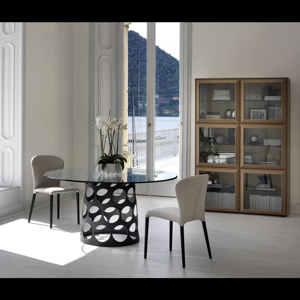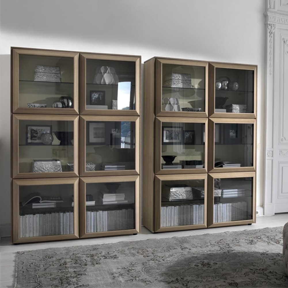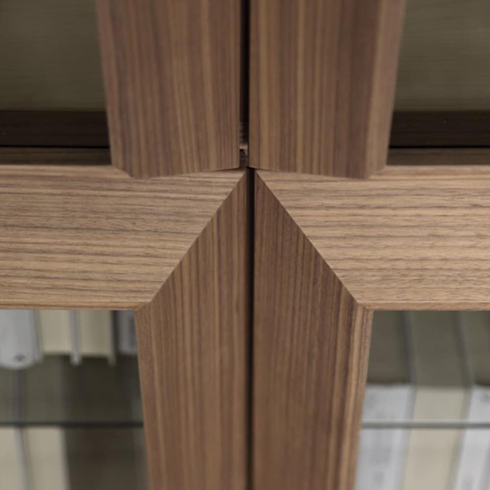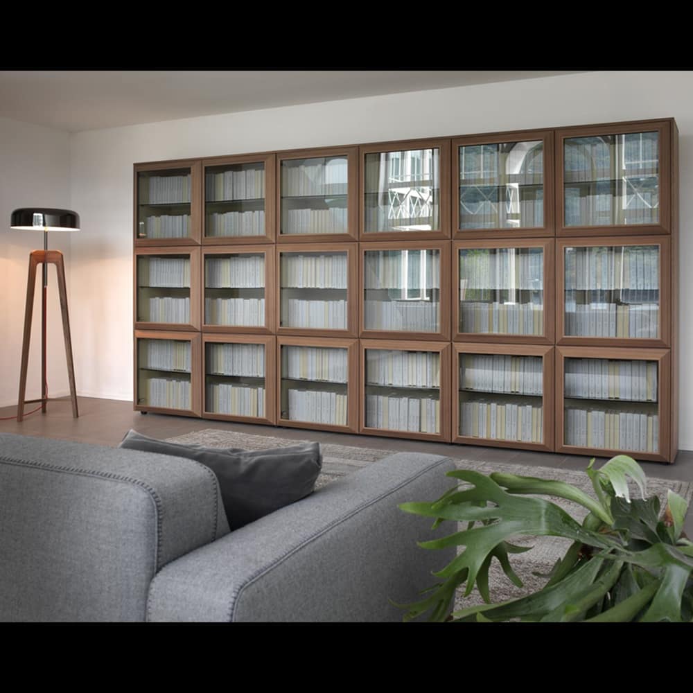 Modular system in canaletta walnut with one- or double-faced elements with glass or wooden doors and corner elements with glass door. The inside of the container is in Canadian maple.