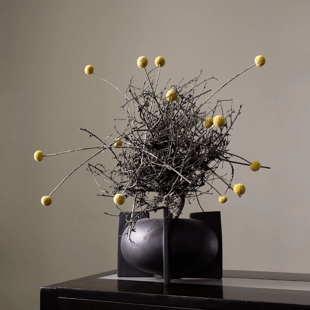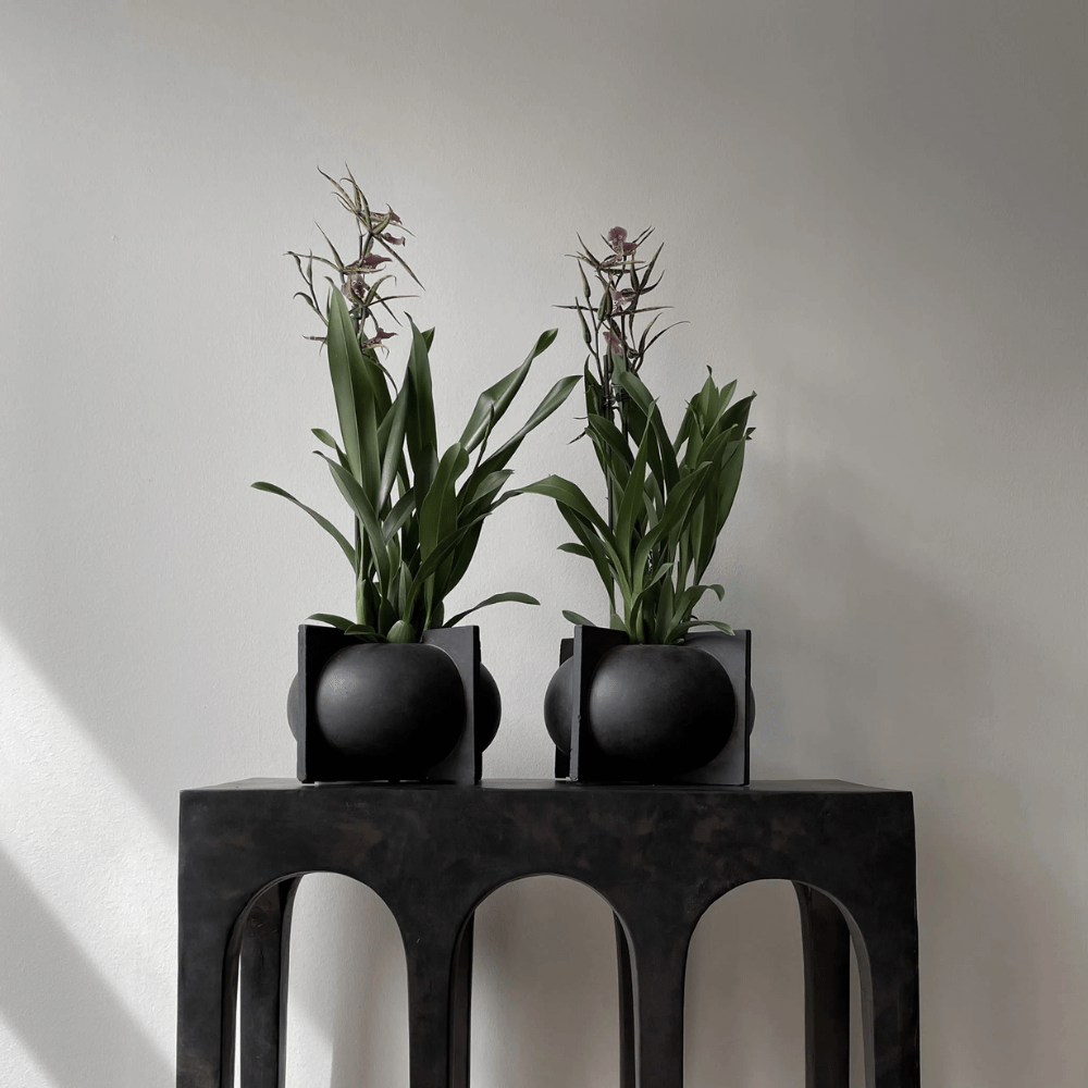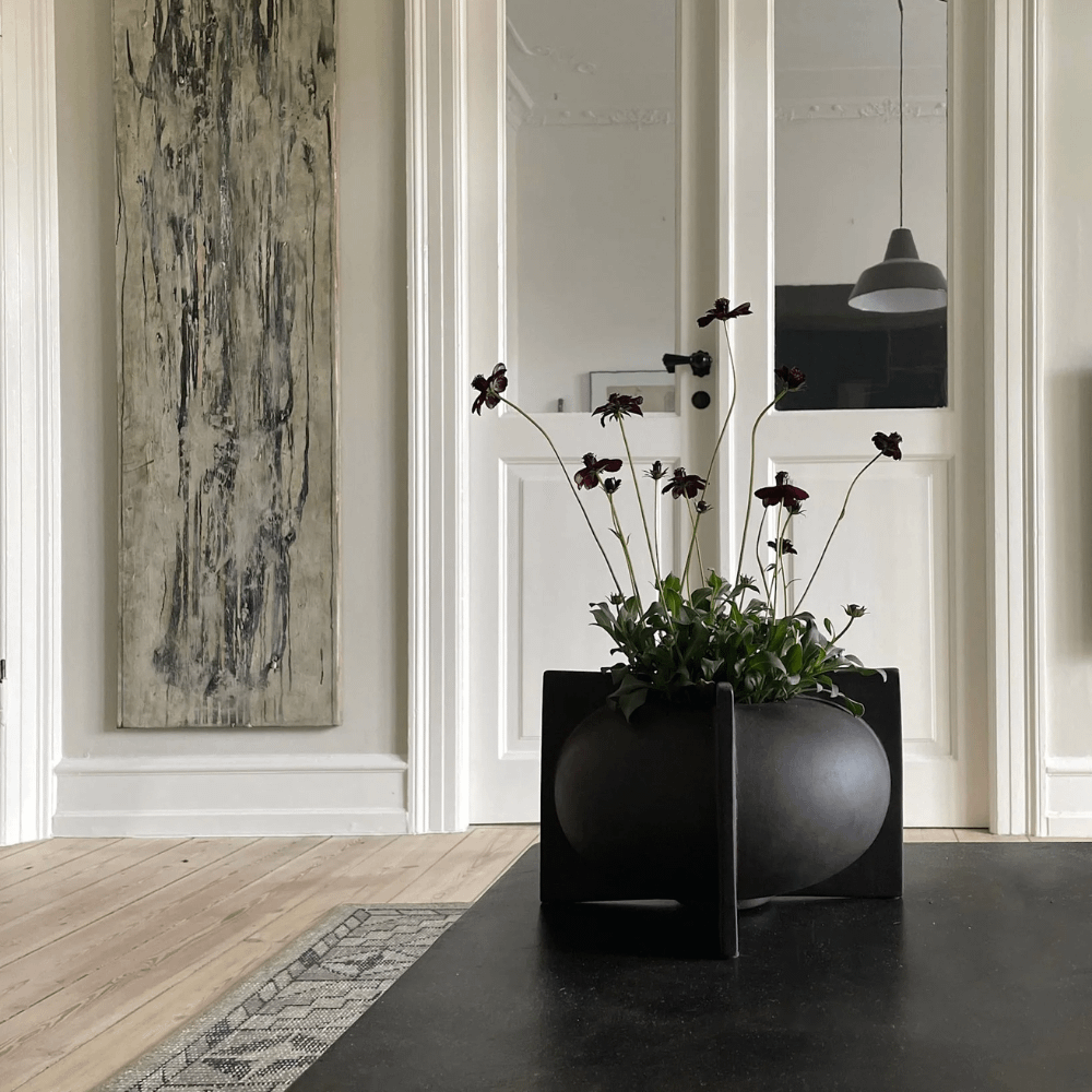Complex and yet so simple. Kyoto is inspired by the form of ancient Japanese and Chinese vases. It is designed as a cross of four massive walls, lifting an oval shaped sphere revealing a circular opening in the center. The two different sized vases are crafted in ceramic and are hand glazed. As it is a natural product, the colours may vary a little and as it is not 100% waterproof, a bag for fresh flowers is included. Designed by Kristian Sofus Hansen & Tommy Hyldahl.