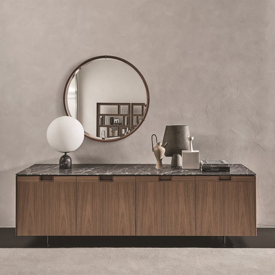 Sideboard with four wooden doors or glass doors with built-in dimmable LED lighting. Metal base in grey pewter finish, frame in canaletta walnut and wooden or marble top.