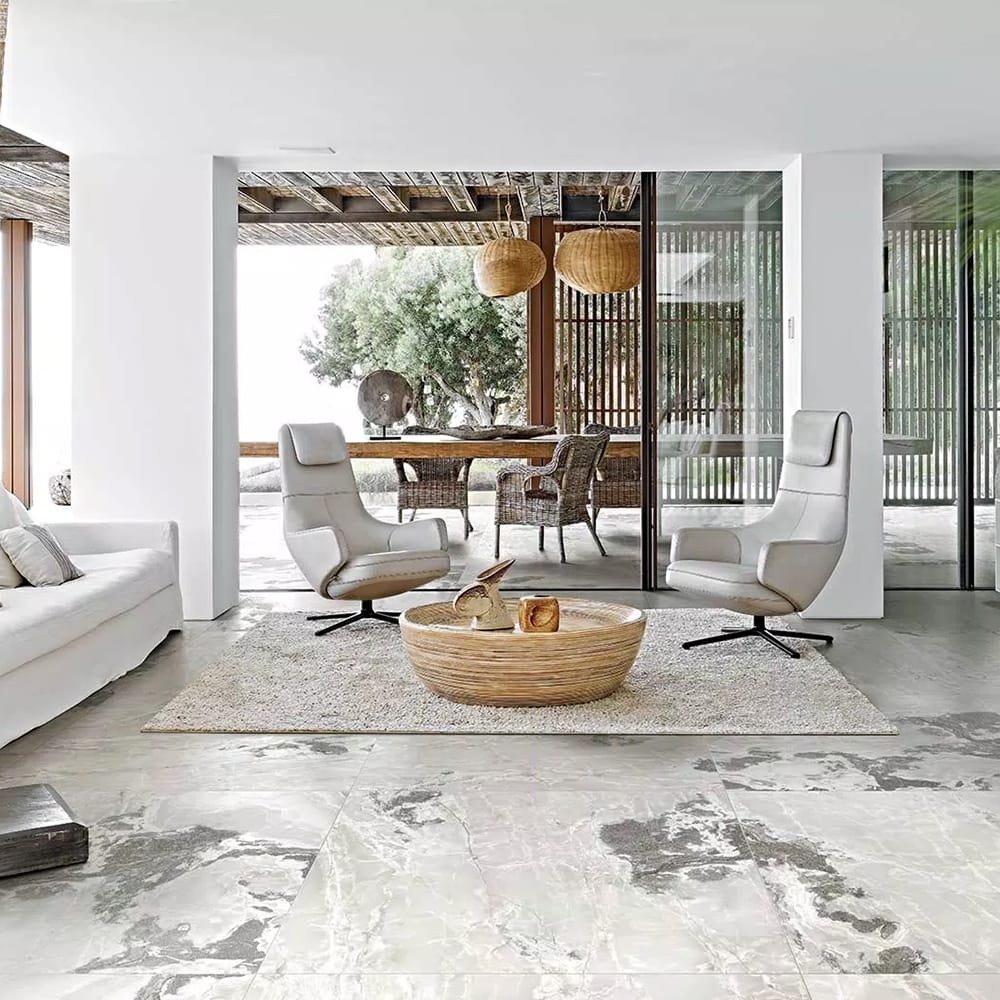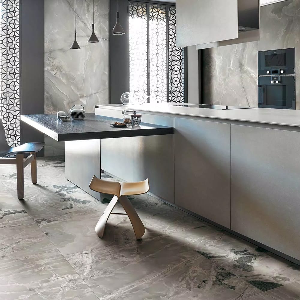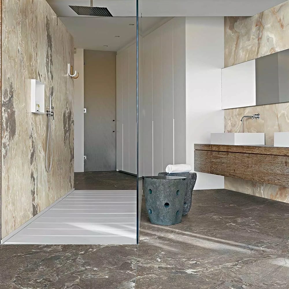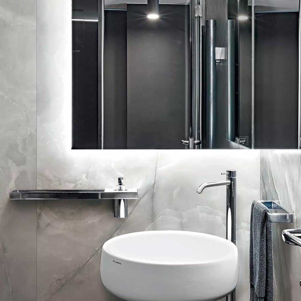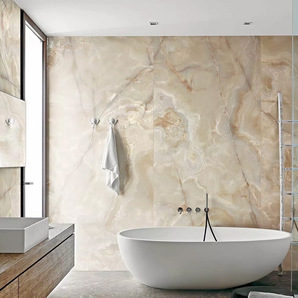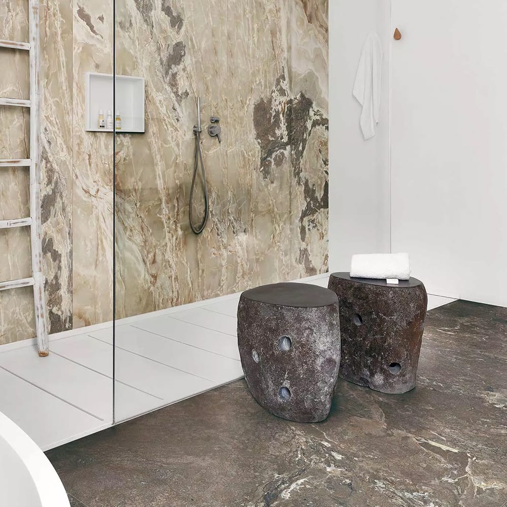 In Onyx&More, the harmonious equilibrium between elegance and creativity reveals itself in the original and extraordinary combination of two very different stones which brings refined, welcoming and intimate spaces into being.