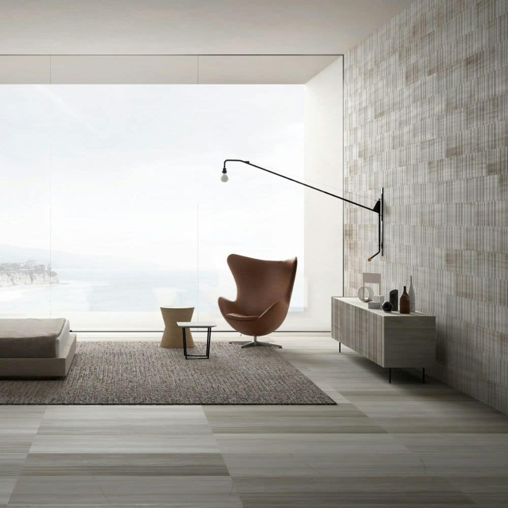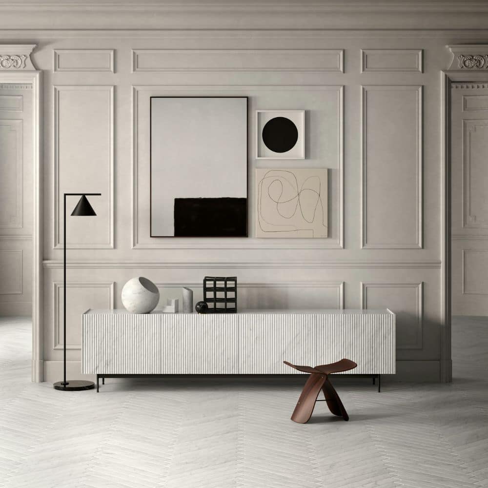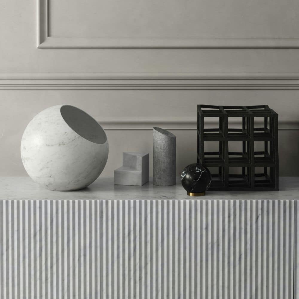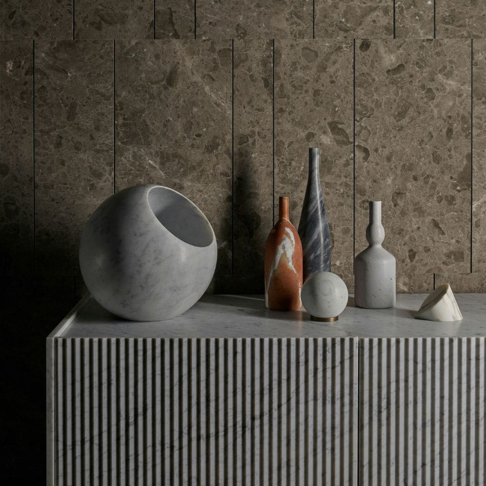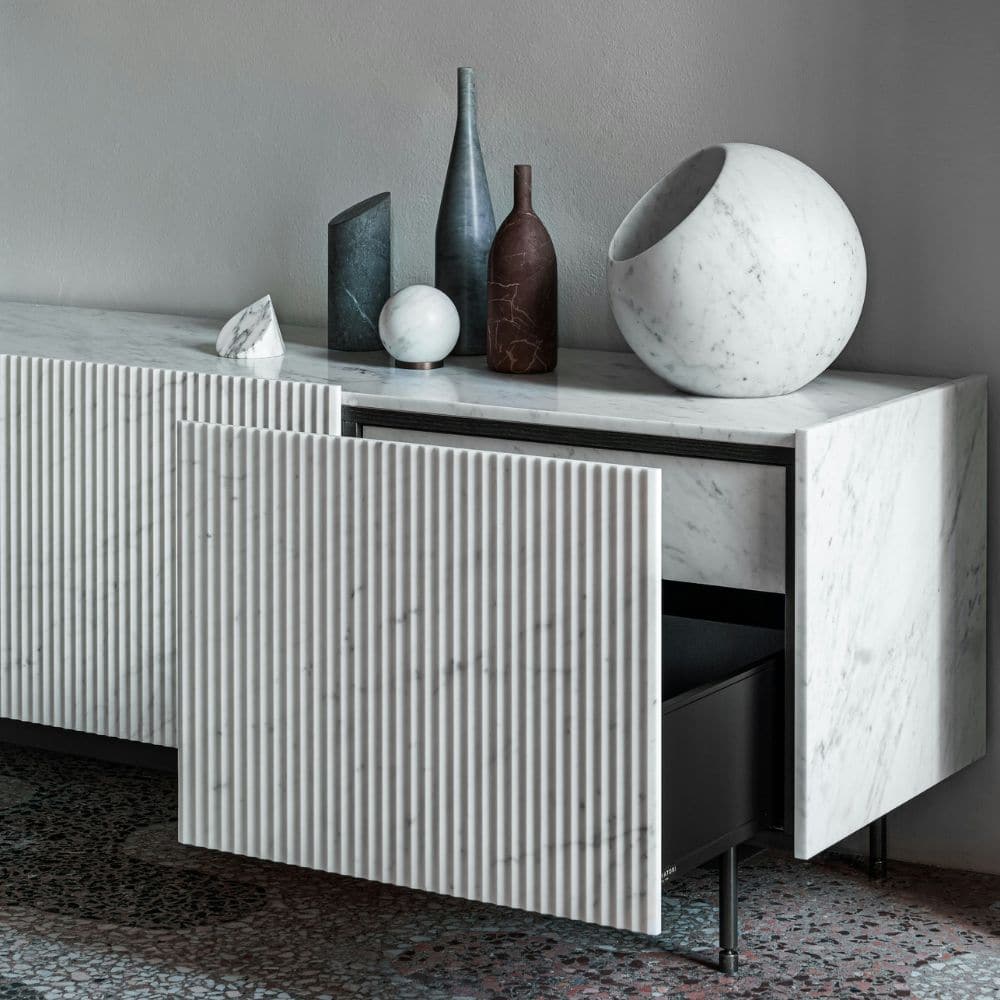 Composed of a horizontally organised series of deep drawers set in a natural stone casing, it sits aloft slender metal legs that contrast its heroic materiality. Named for the pleated — or Plissé — finish of the front panels, Pliss artfully conceals its various moving parts camouflage within the design, creating a monolithic, sculptural effect.