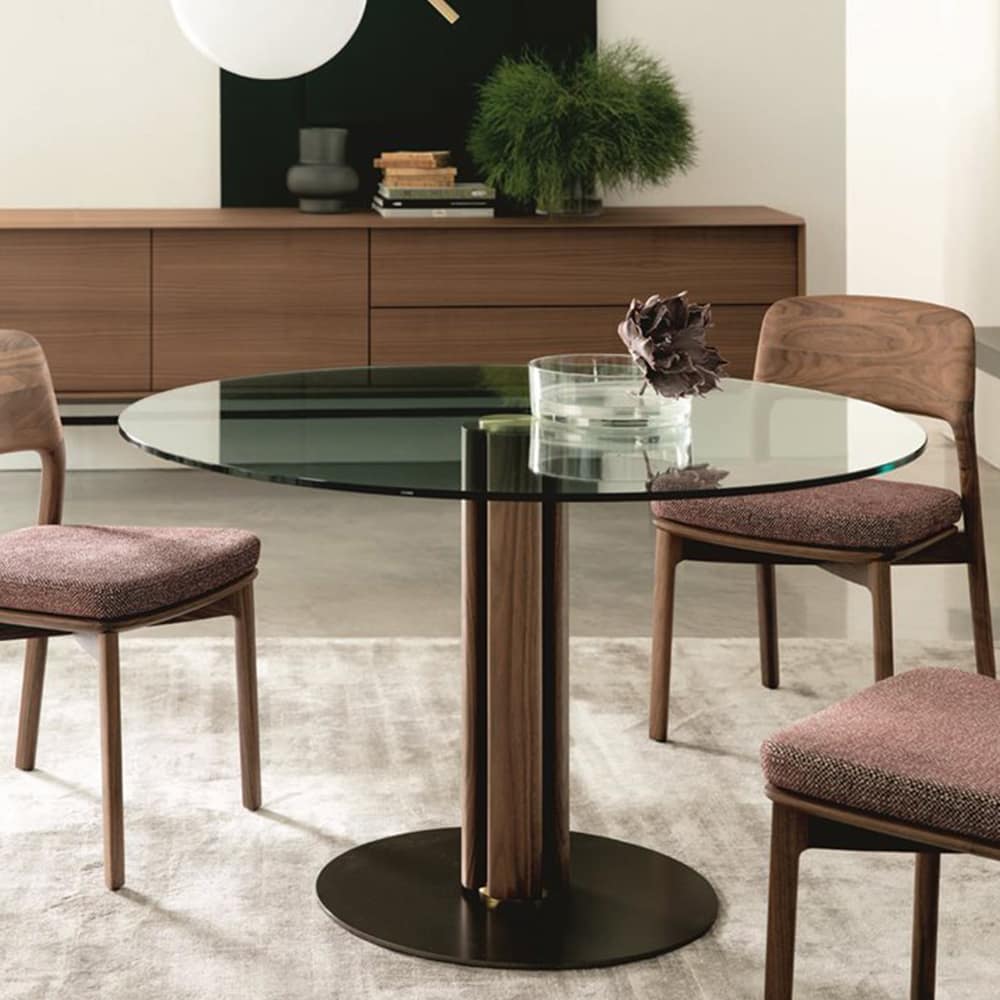 This dining table set is available in many shapes, sizes, and materials. The round tabletop version comes in small sizes, with one or three legs; the rectangular or square dining table is made with four or six legs, with metal details in Bronzoro or brushed brass.