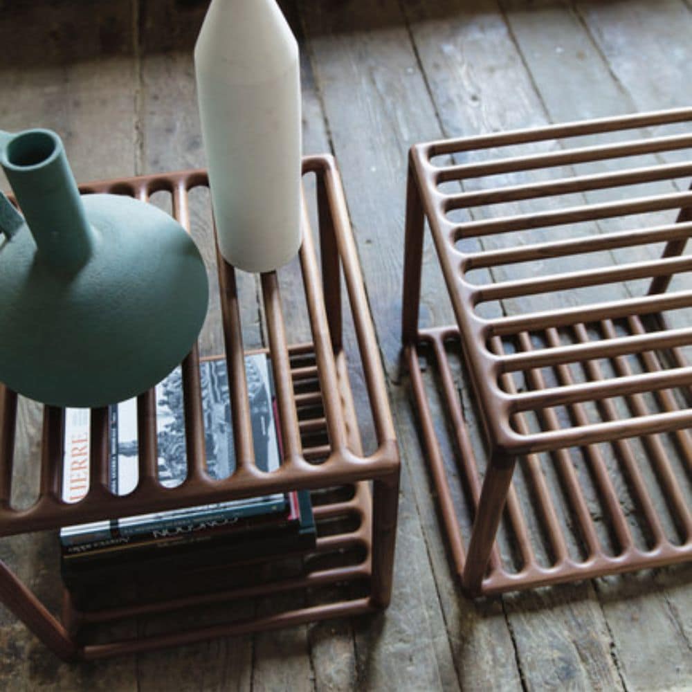 The Porada Raster Side Table is a contemporary accent piece crafted by Italian furniture brand Porada, known for its mastery of woodwork and timeless design. This table features a cylindrical base composed of interlocking vertical and horizontal wooden slats, forming a grid-like “raster” structure that evokes architectural rhythm and visual transparency. The top is typically round, available in solid canaletta walnut, clear glass, or marble, offering a refined surface that complements the sculptural base.