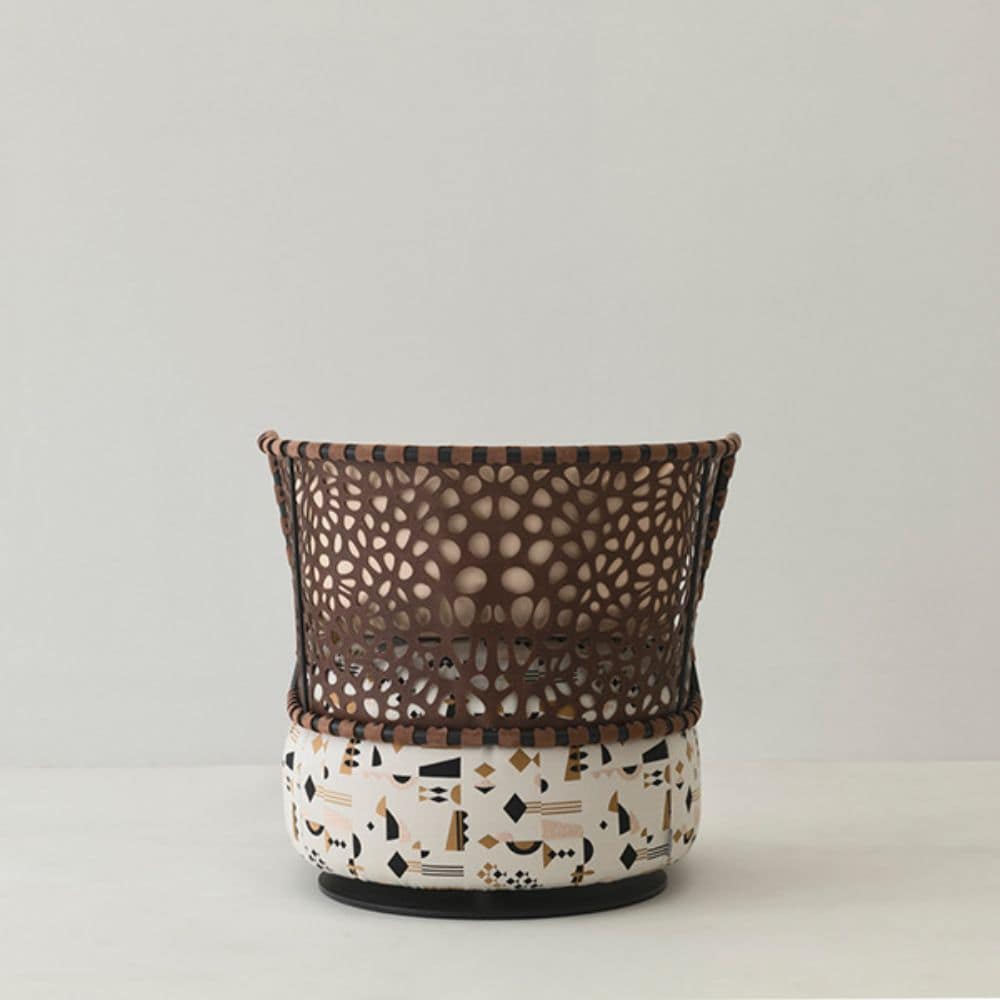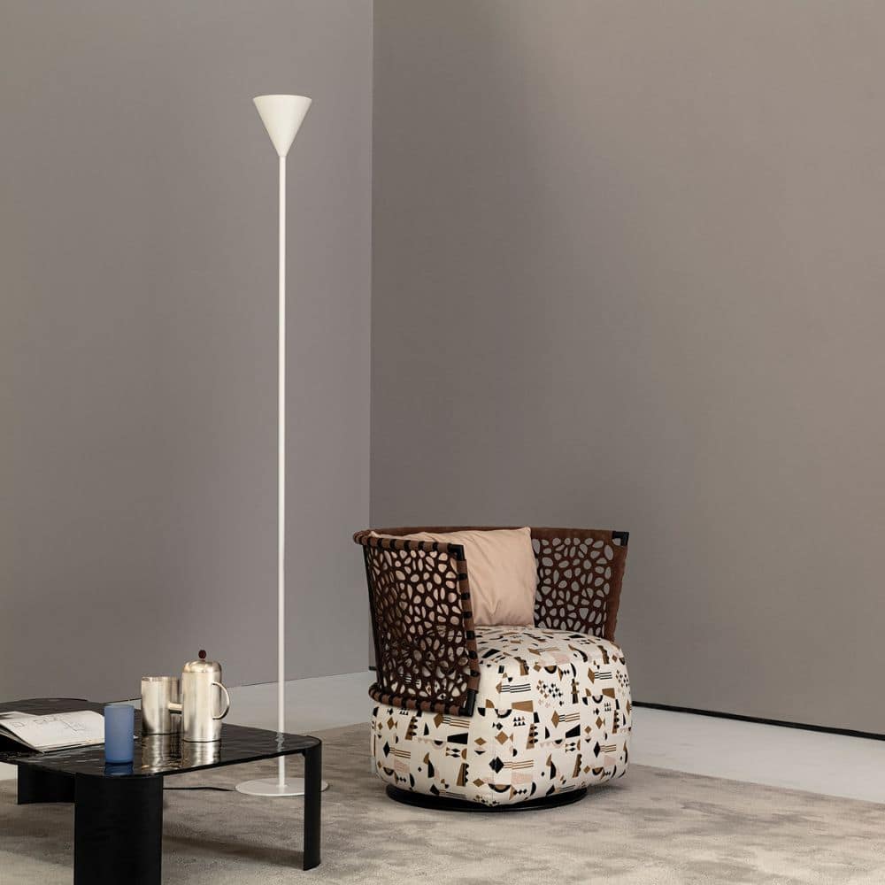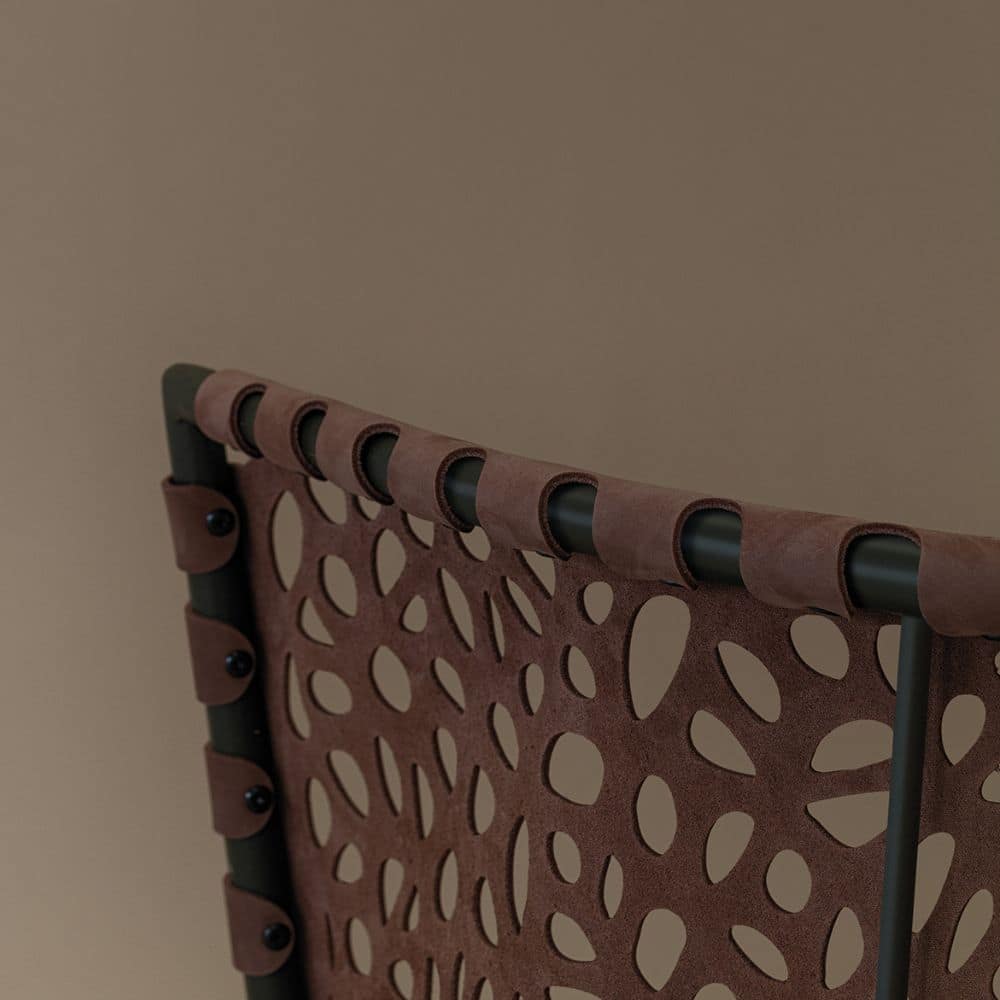 If your house were a kingdom, it would certainly have its exotic queen, a black pearl of bewitching beauty. Regis would be her throne, with its simple cylindrical frame that stretches upwards, and the fine engraving in the leather seat-back: imagery that suggests lush plants and the tracks of wild foxes.