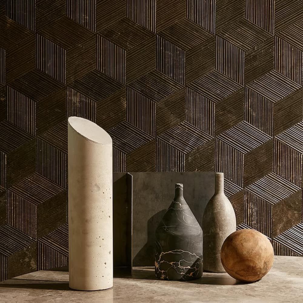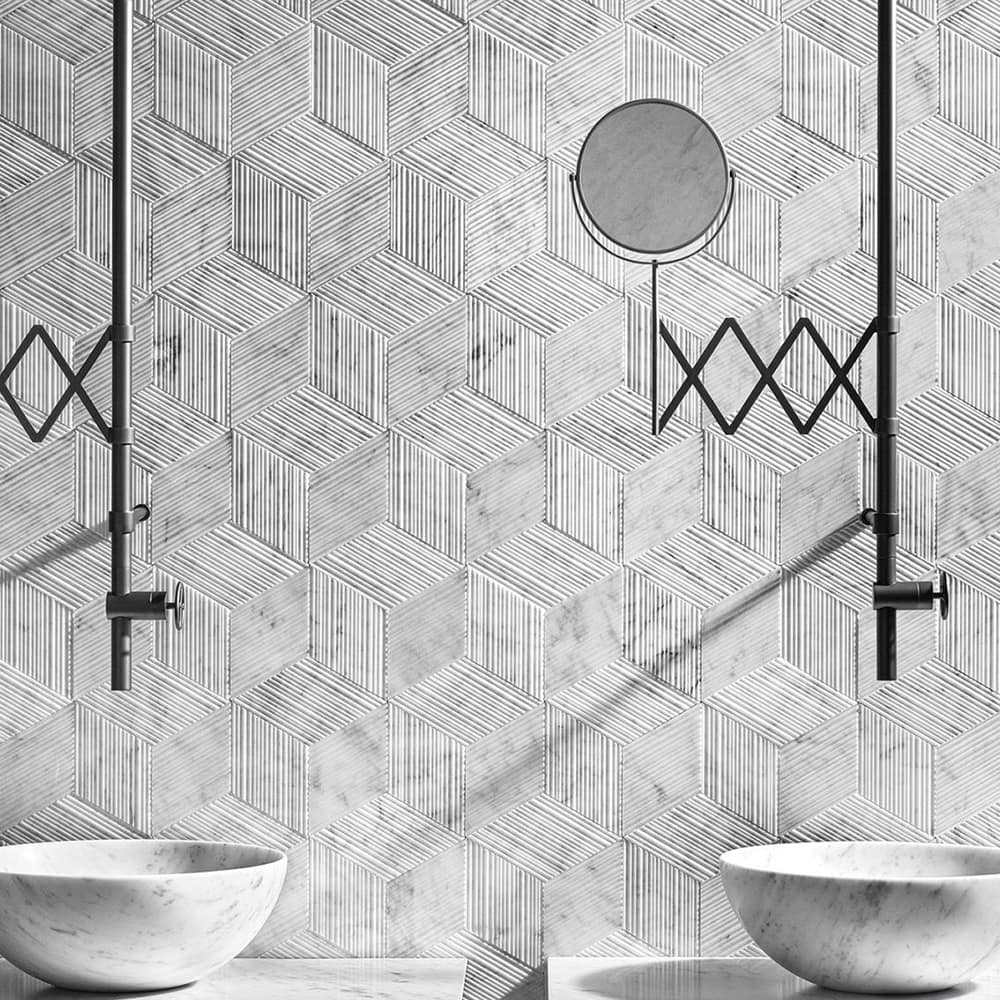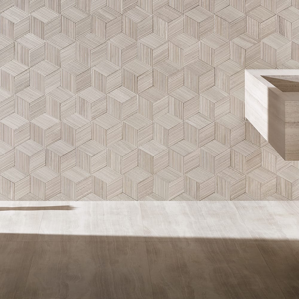 Cut into small, rhomboid-shaped tiles, the result is a product that contains an elegant hint of the Orient, with the clean, simple lines of Bamboo sliced on the diagonal. Placing these diamond-like pieces together creates a striking three-dimensional effect in natural stone that becomes even more dramatic with the addition of artfully-placed lighting.