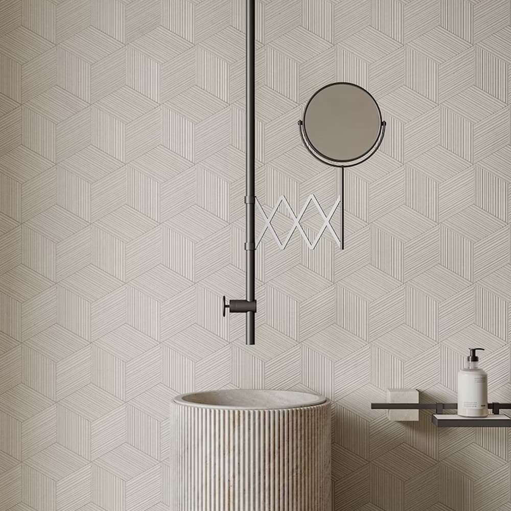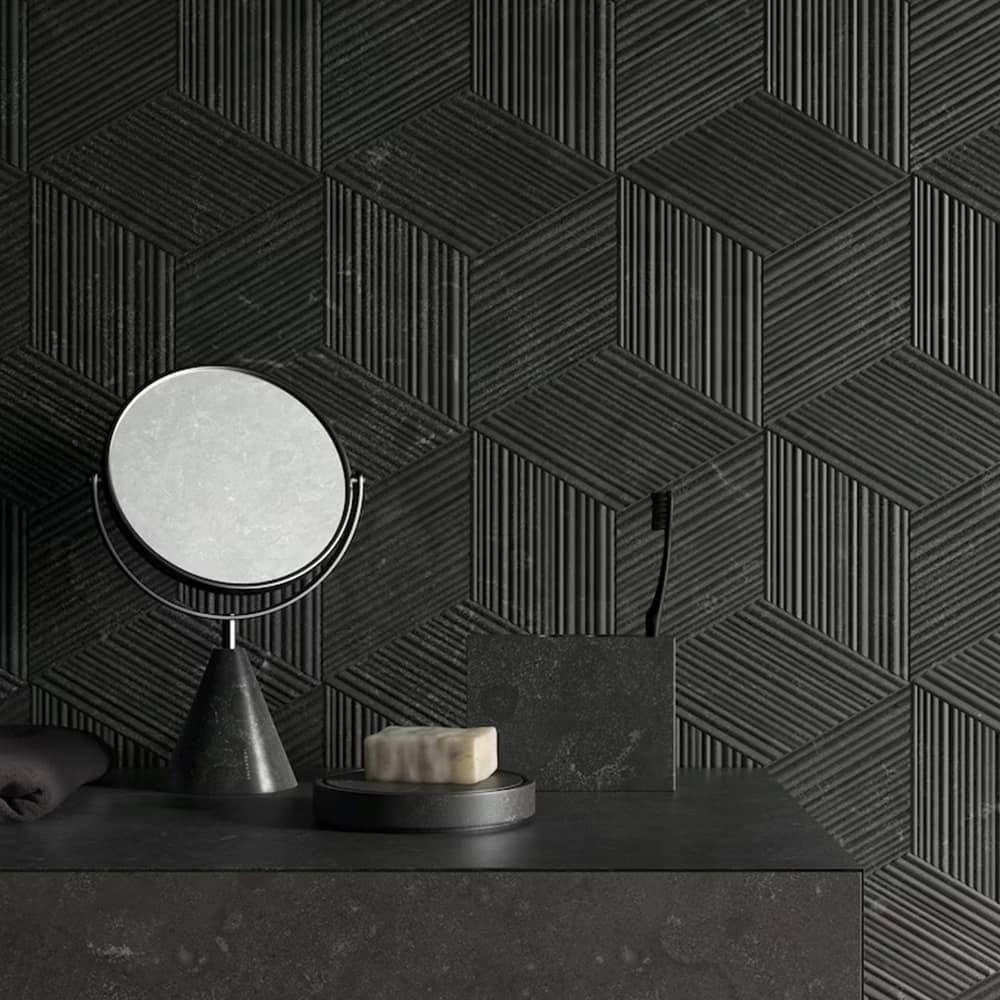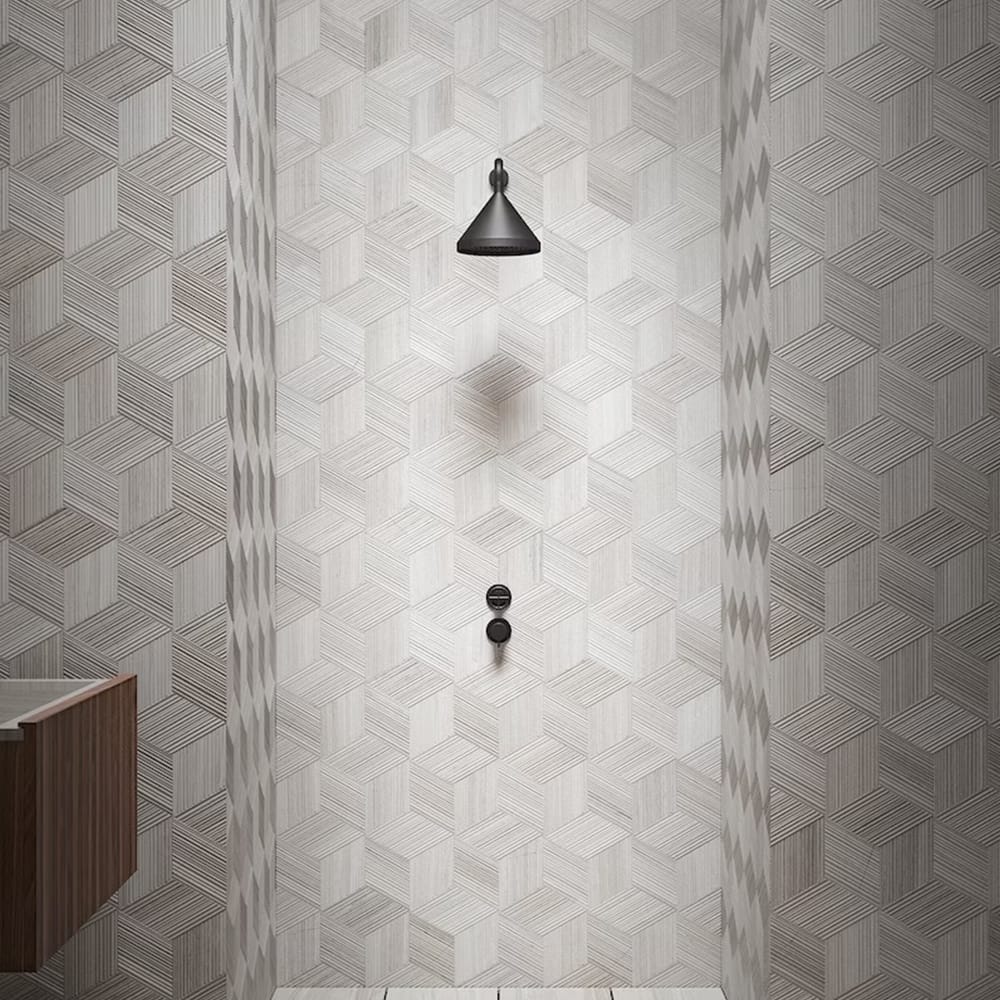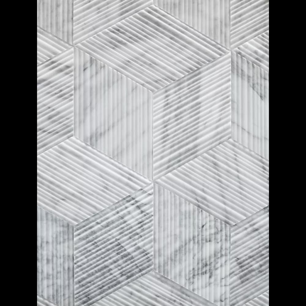 Cut into small, rhomboid-shaped tiles, the result is a product that contains an elegant hint of the Orient, with the clean, simple lines of Bamboo sliced on the diagonal. Placing these diamond-like pieces together creates a striking three-dimensional effect in natural stone that becomes even more dramatic with the addition of artfully-placed lighting.