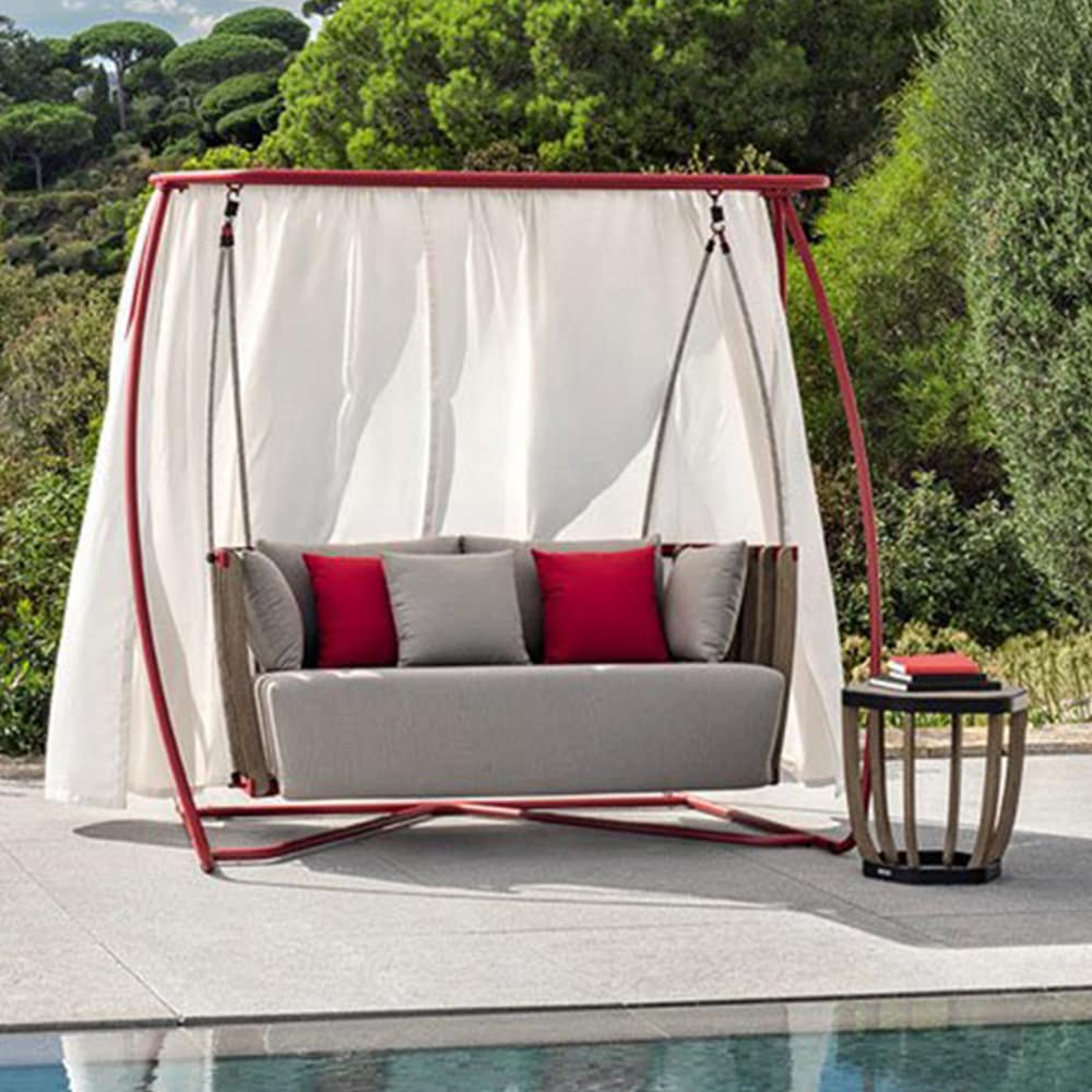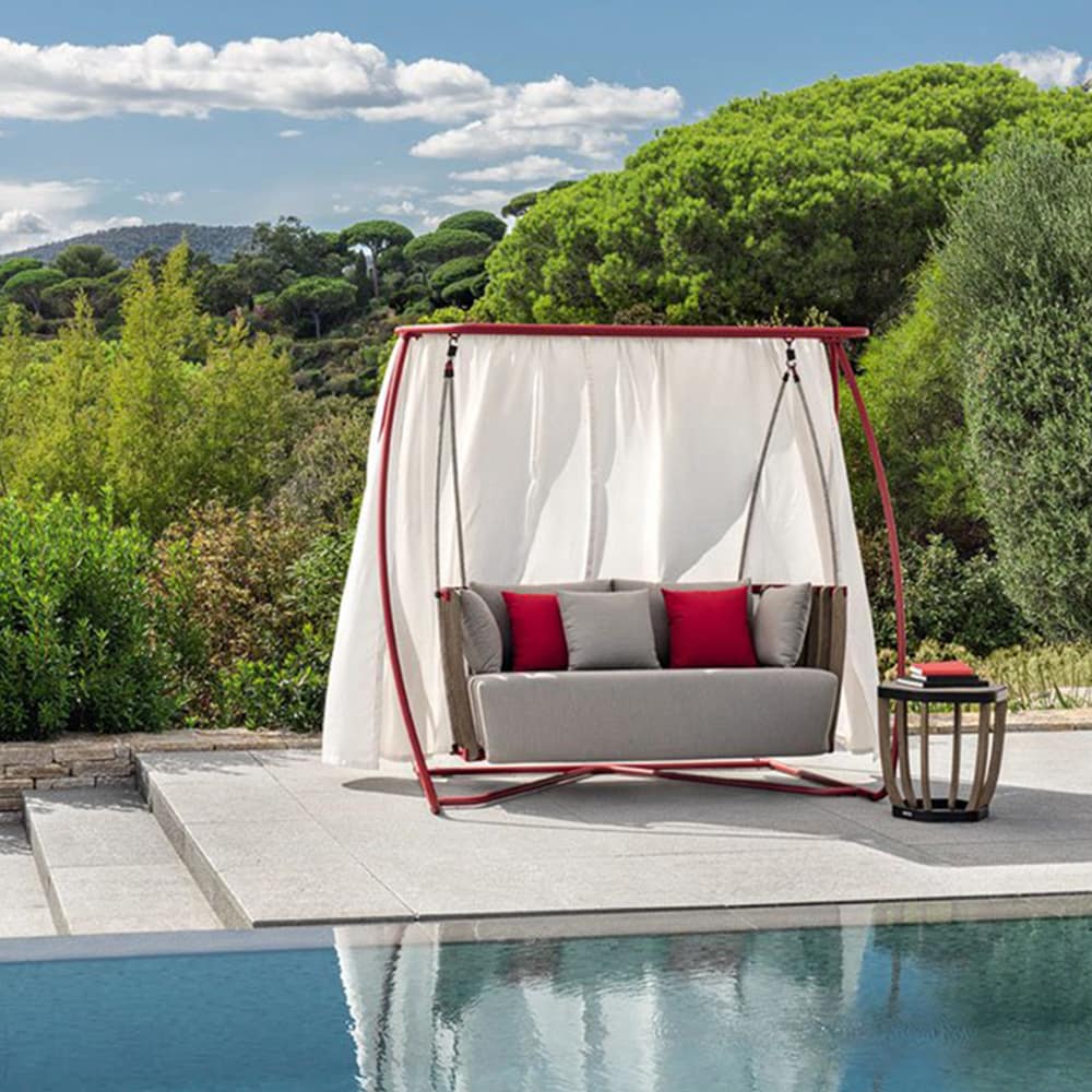 Swing, a collection of lounge furniture with a dual structure: one an external metal layer, the other an internal layer made with slats of teak, the combination of which creates a balanced alternation of lines and materials. The collection, now an icon of outdoor living, is made up various pieces of lounge furniture: armchairs, sofas, and other modular elements that make it possible to create an infinite combination of arrangements for open air living.