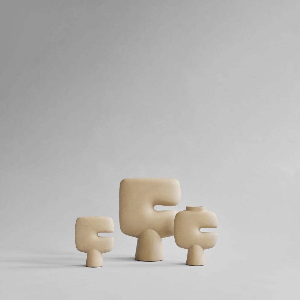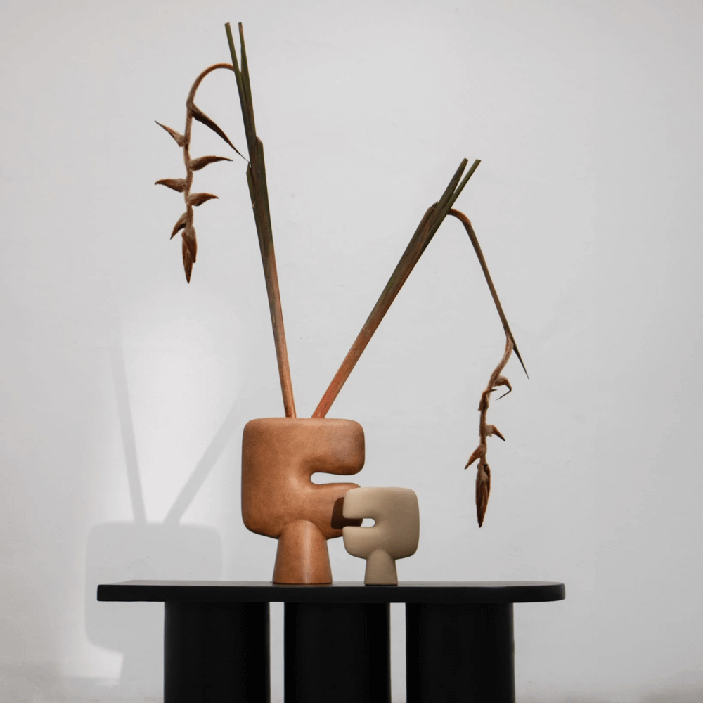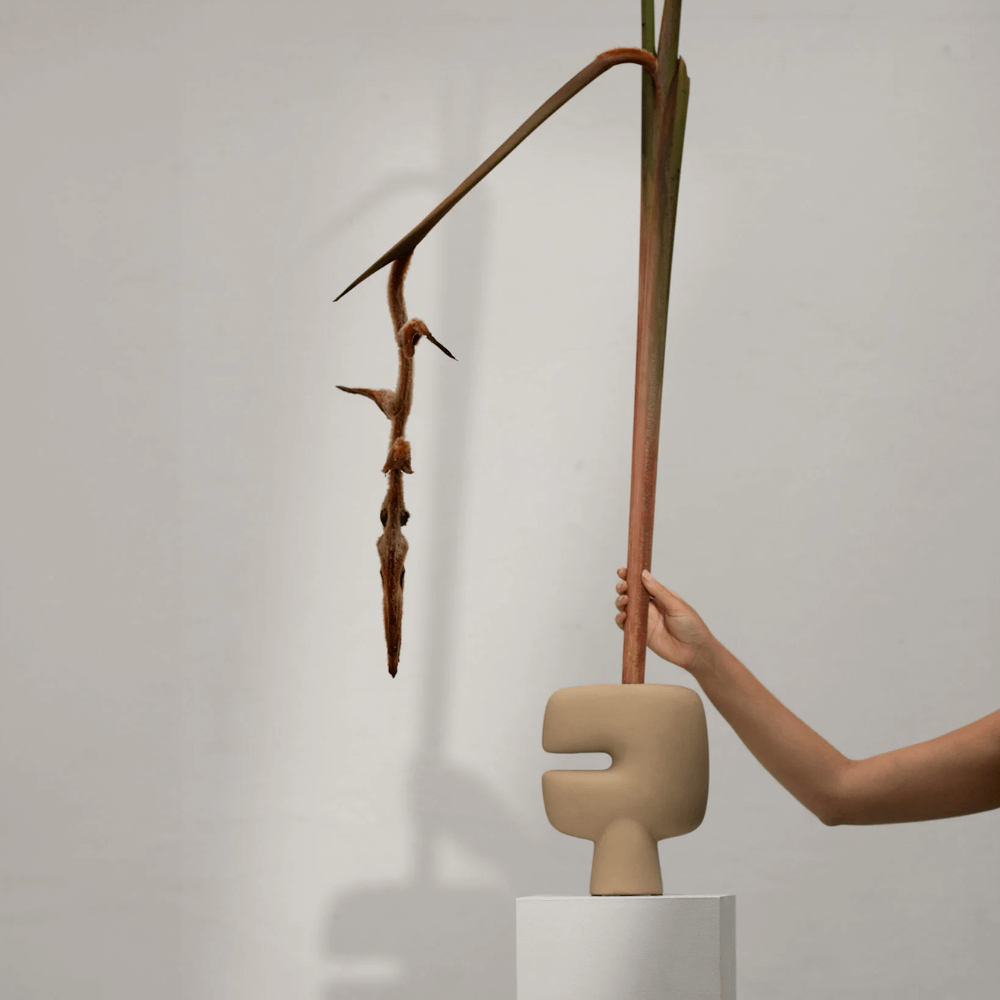 Place single flower stems in the narrow top opening or simply leave the vase as a stand-alone art object. Like open mouths on pedestals, the masks are a beautiful, shaped item in calm, soothing and dusty terracotta and grey colours.