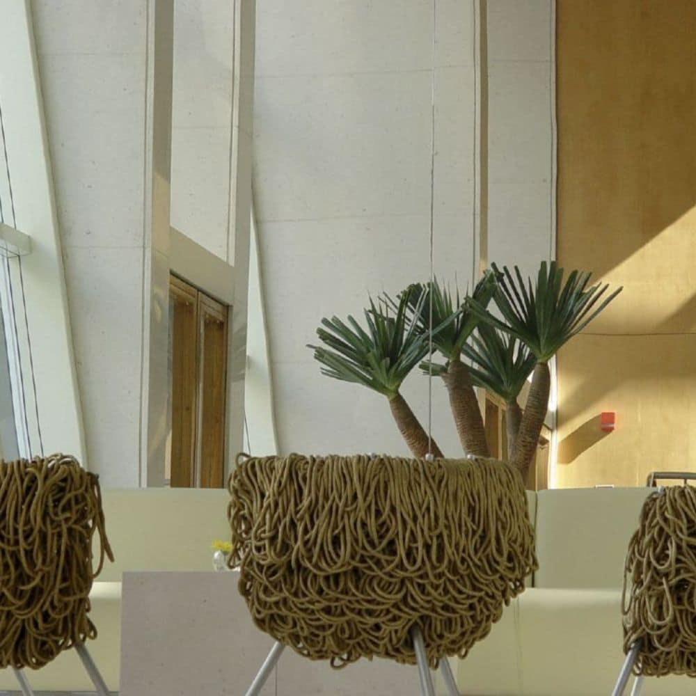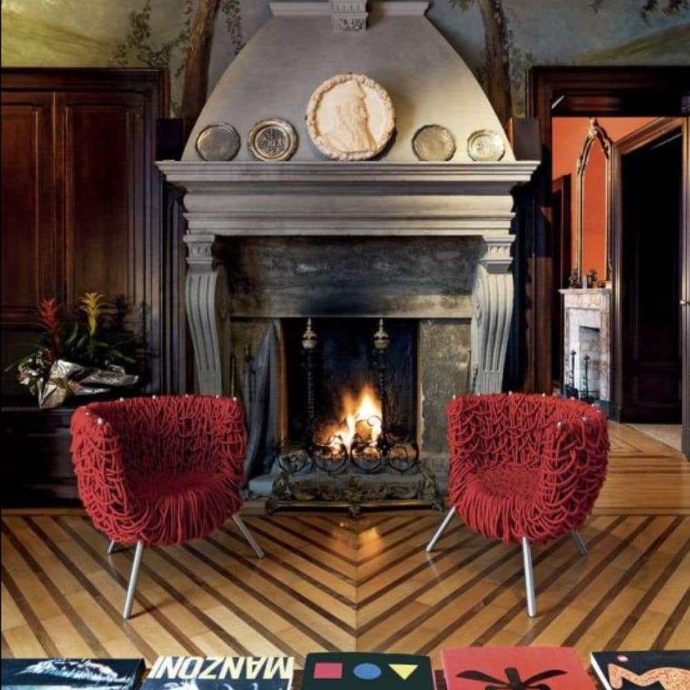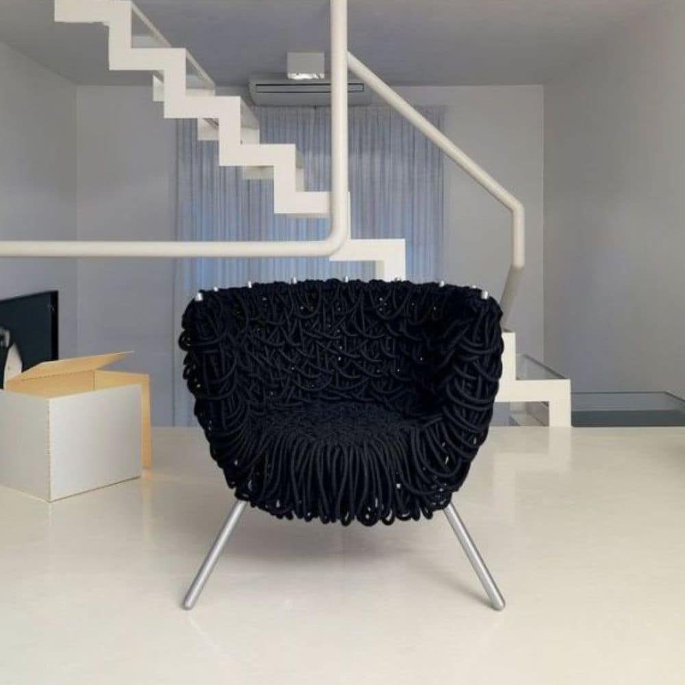 Wrap-around armchair with steel frame. Innovative chair, created by the overlapping of hundreds of twists of about five hundred meters of special rope with acrylic core, on the base frame.