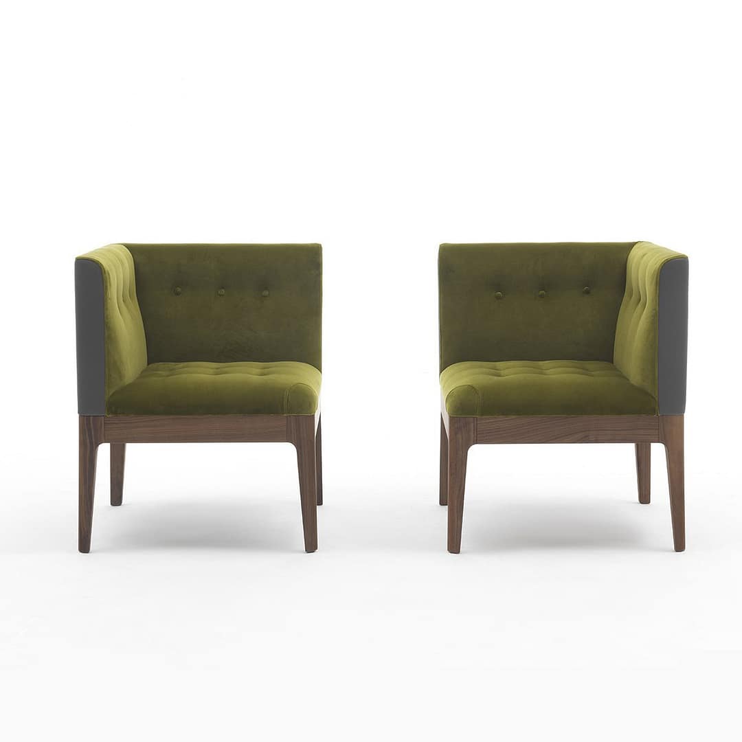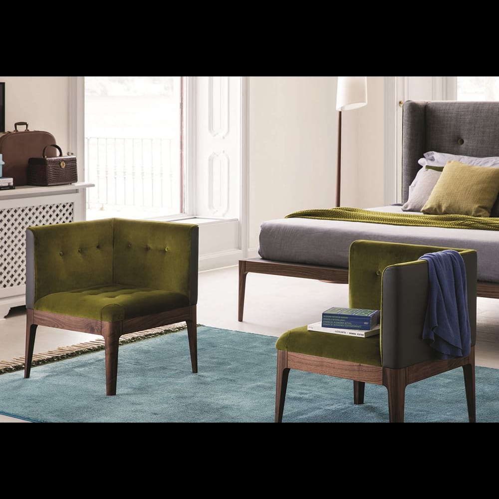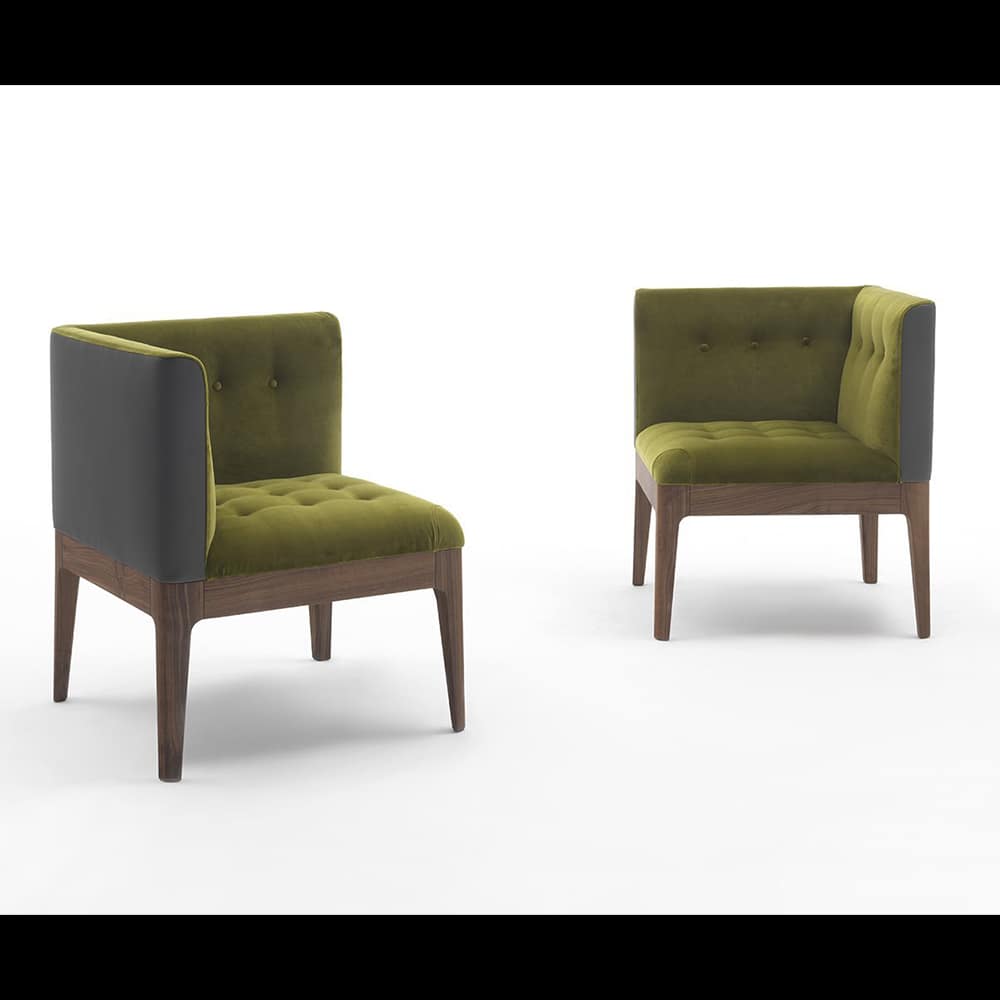 Corner easy chair with frame in solid canaletta walnut and seat with capitonné decoration upholstered in the fabric of the collection. It is possible to combine different fabrics for seat and back and to purchase the buttons ton sur ton or in contrast.